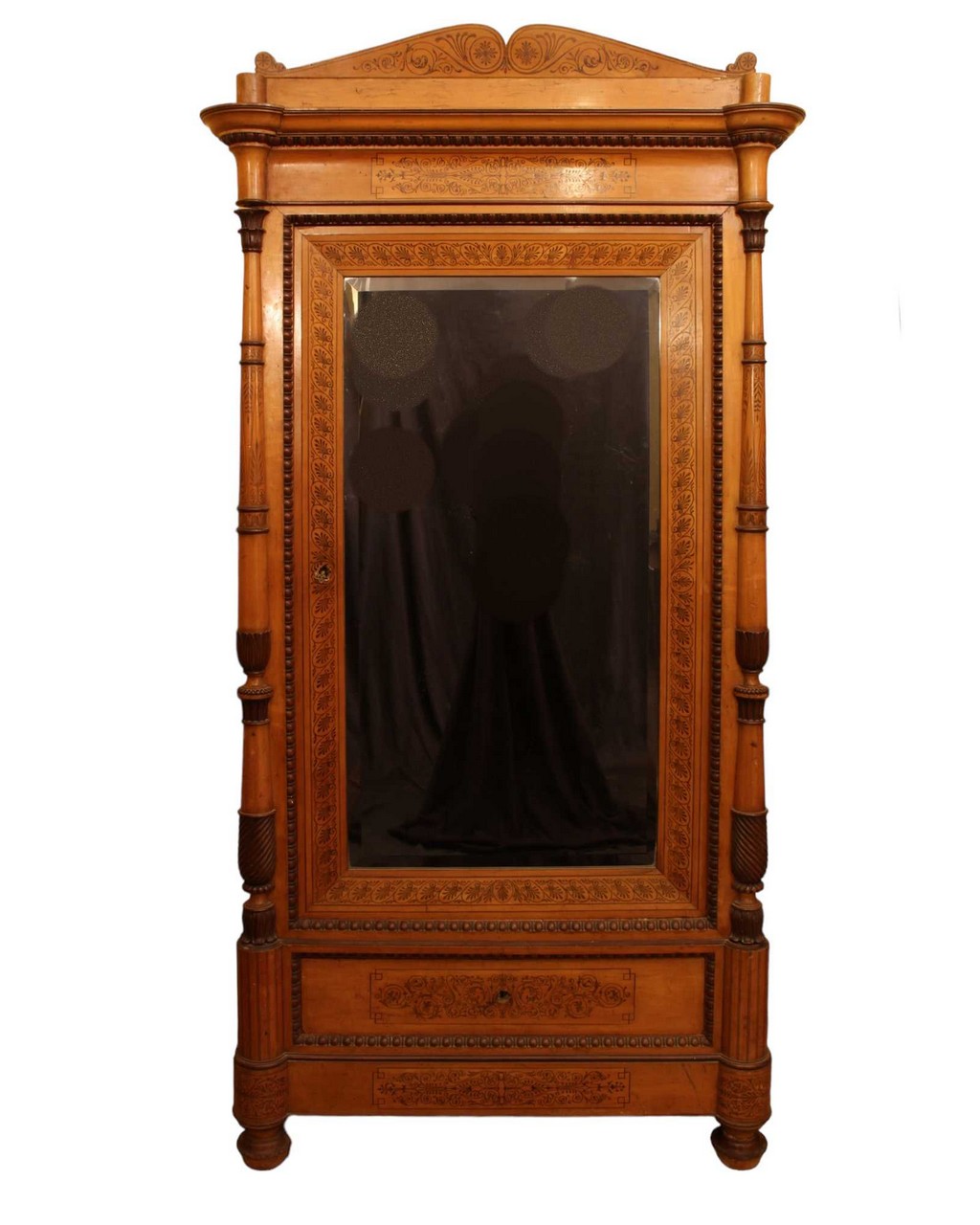 ARMADIO CARLO X in acero, riccamente decorato da estese tarsie in palissandro. Anta con specchio e tiretto sottostante. Lesene arricchite da colonne tornite e cimasa con modanatura aggettante ed intarsiata XIX secolo Sicilia h cm 230 x 116 x 55