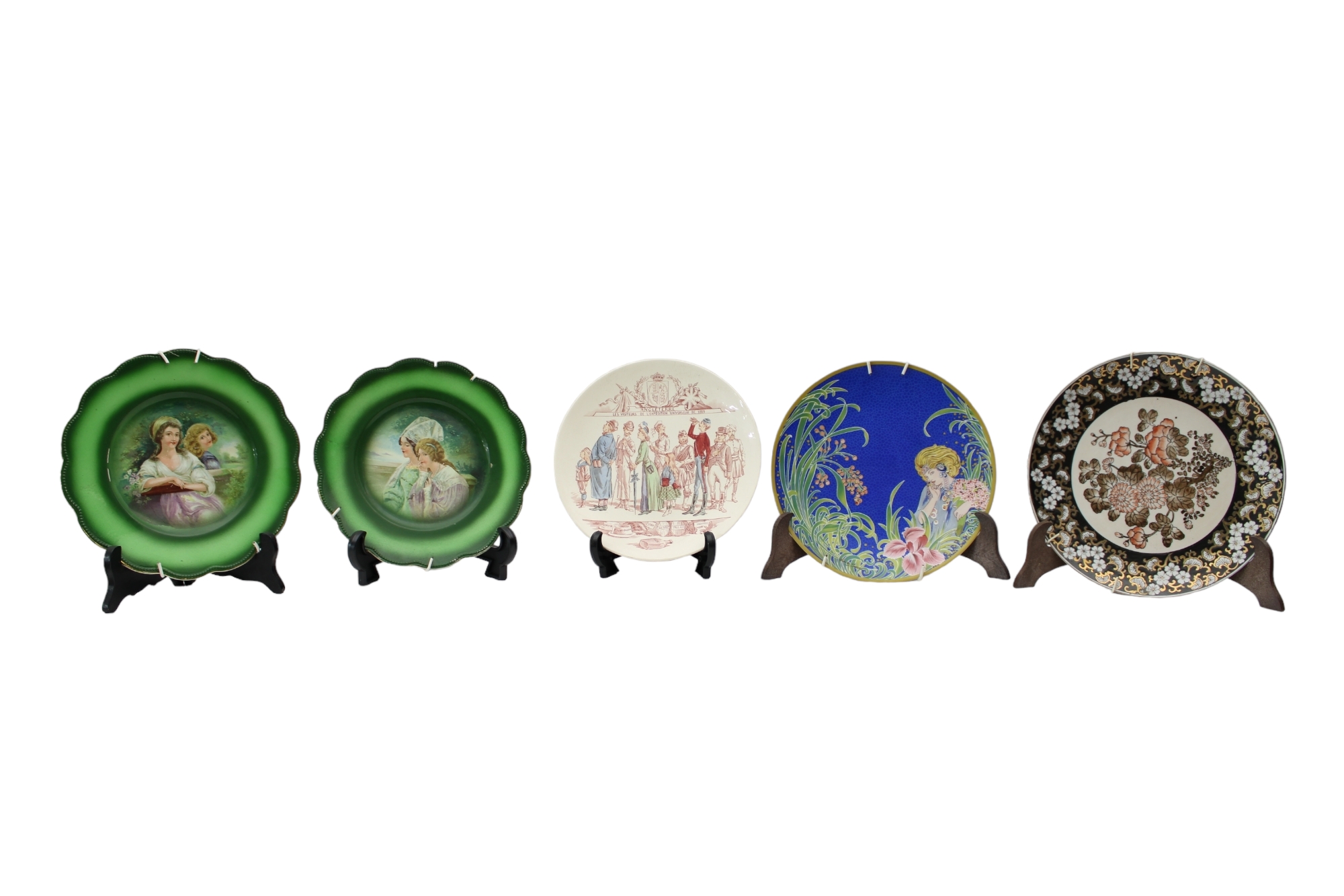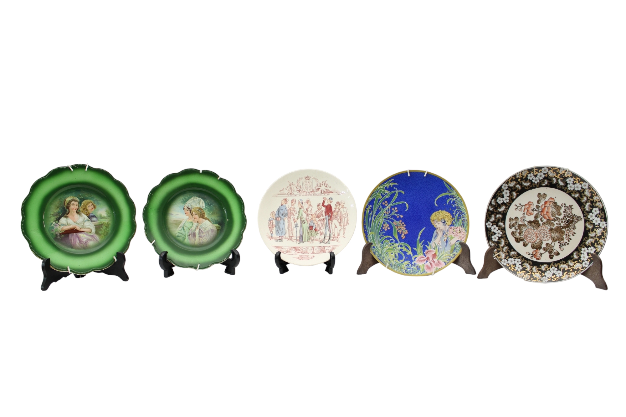 LOTTO DI 5 PIATTI DECORATIVI in porcellana dipinta raffiguranti vari soggetti diverse manifatture XIX / XX secolo misure varie