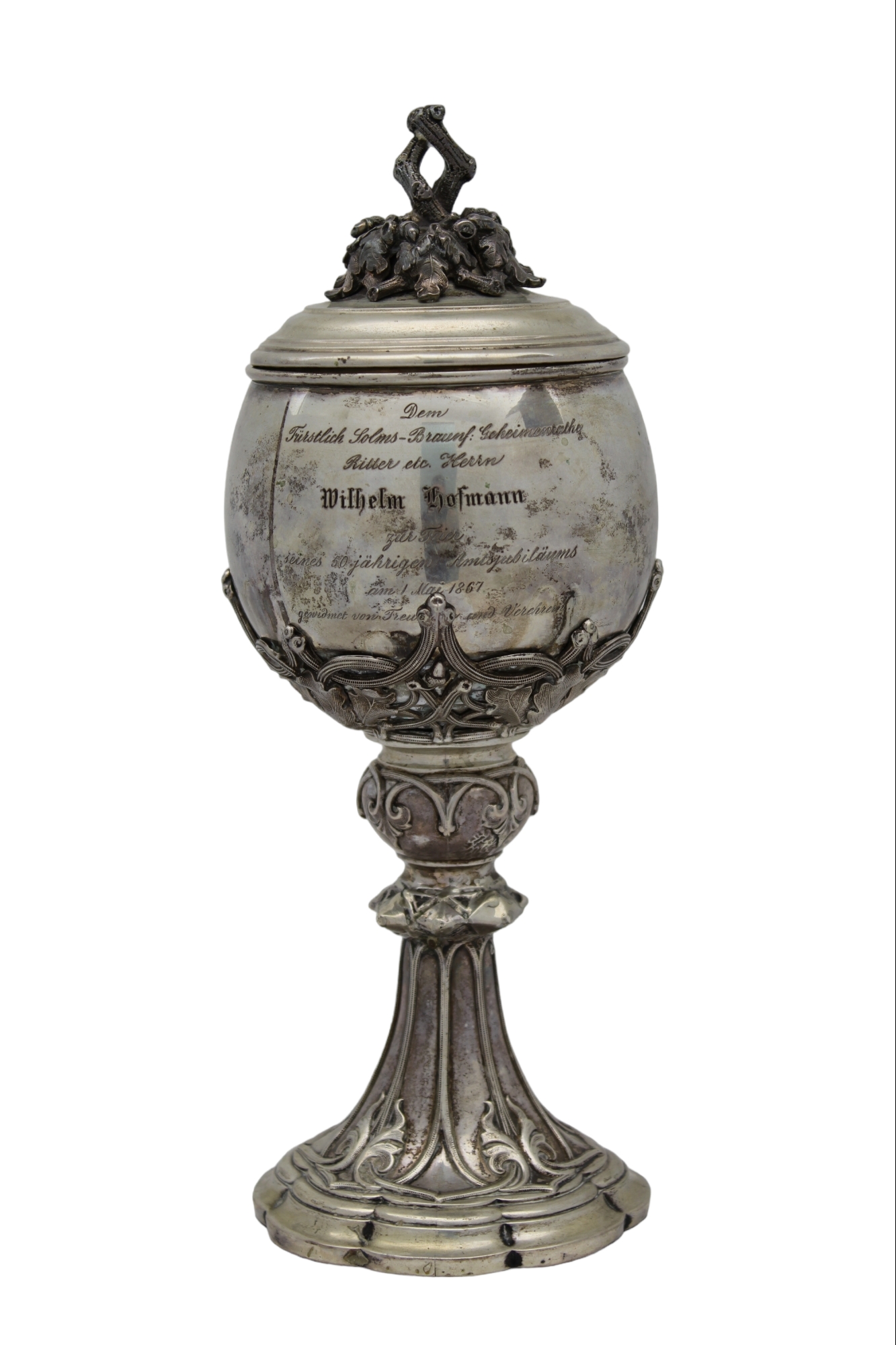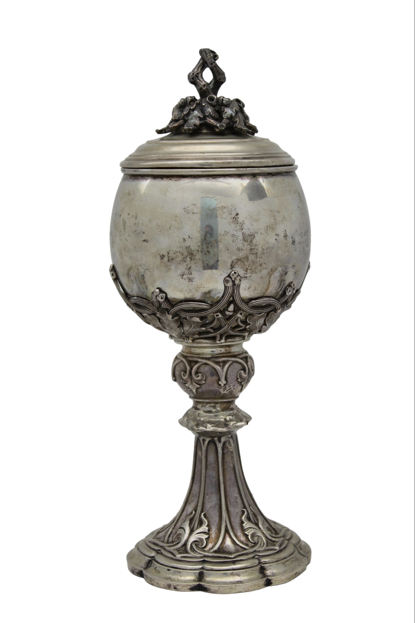 PISSIDE in argento finemente cesellato a motivi gotici grammi 545 maestranze italiane XX h cm 29 x 10