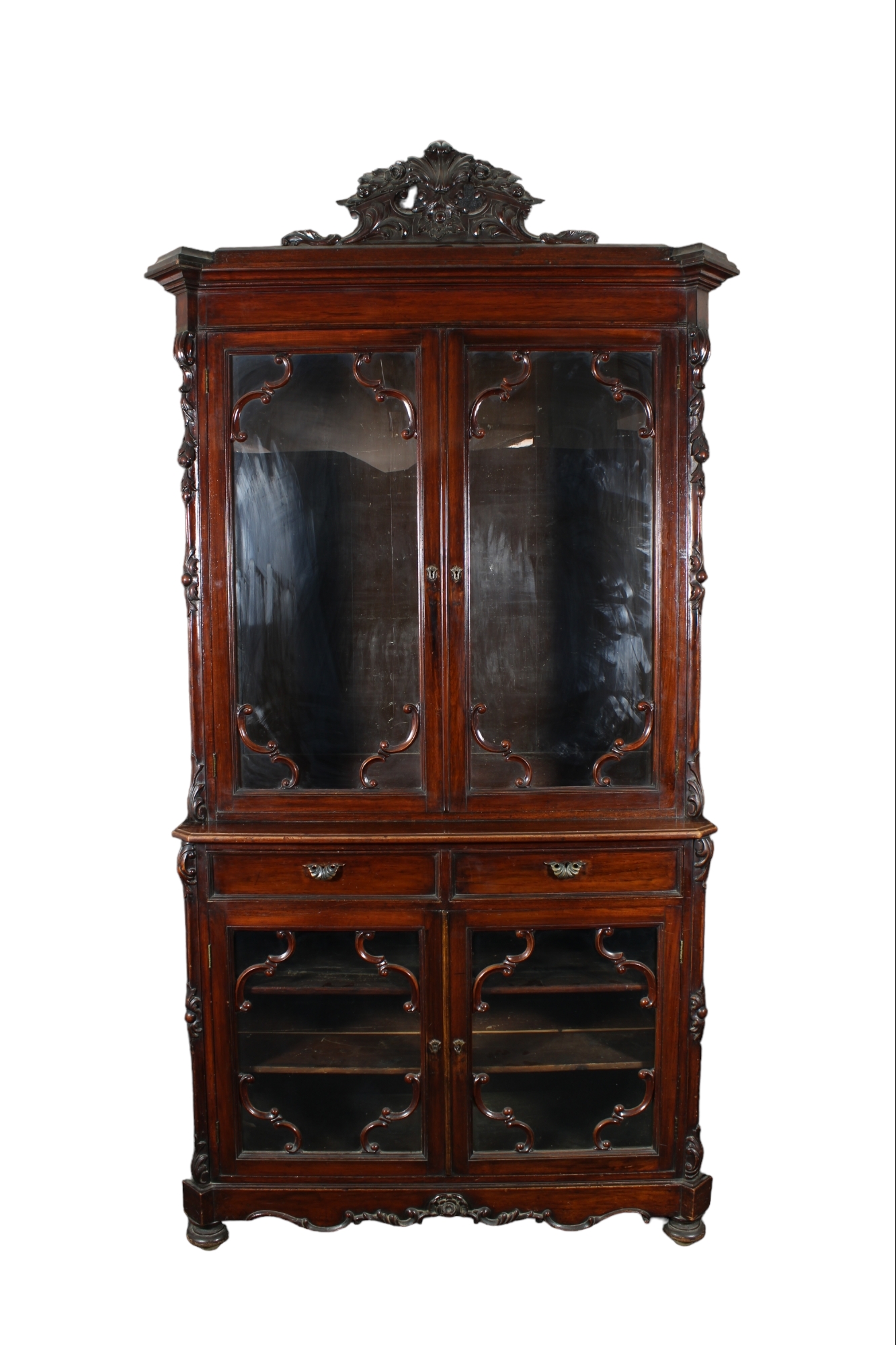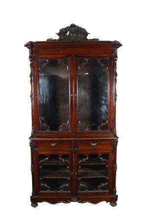 BELLA VETRINA LUIGI FILIPPO DOPPIO CORPO in mogano con ante in vetro decorate da modanature XIX secolo Sicilia h cm 270 x 133 x 58