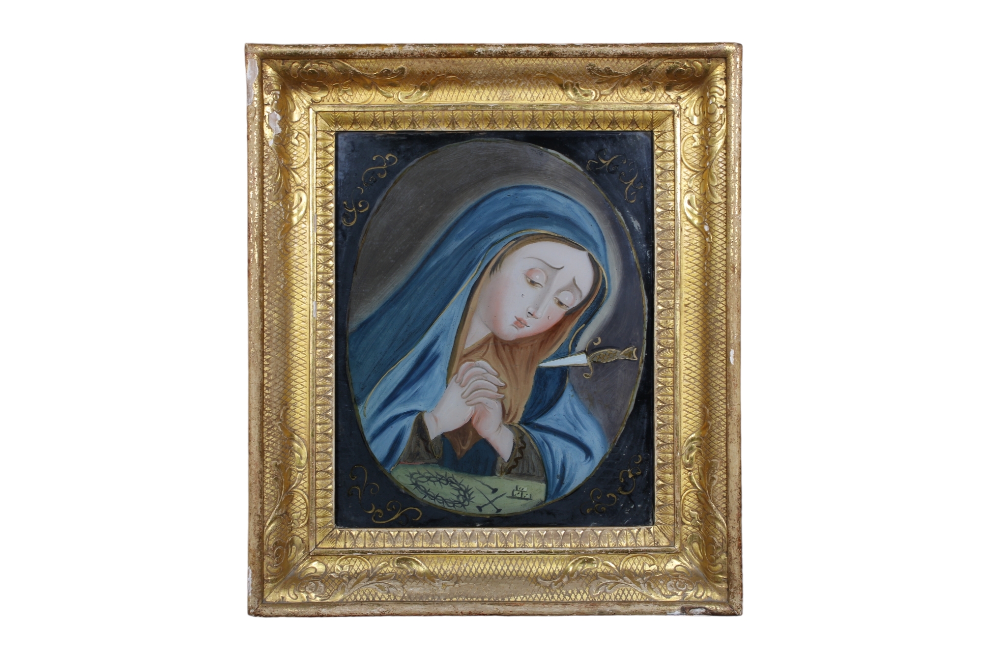 PITTURA POPOLARE SOTTOVETRO Raffigurante Madonna Addolorata con cornice dorata vintage Sicilia h cm 40 x 33 / cornice h cm 57,5 x 50
