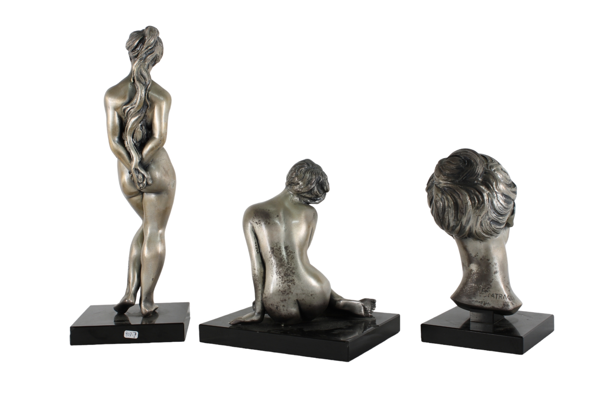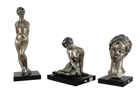 3 SCULTURE in metallo patinato raffiguranti nudi di donna opera dello scultore fiorentino Escatrigli h cm 31 x 7 / h cm 19 x 9 / h cm 17 x 15