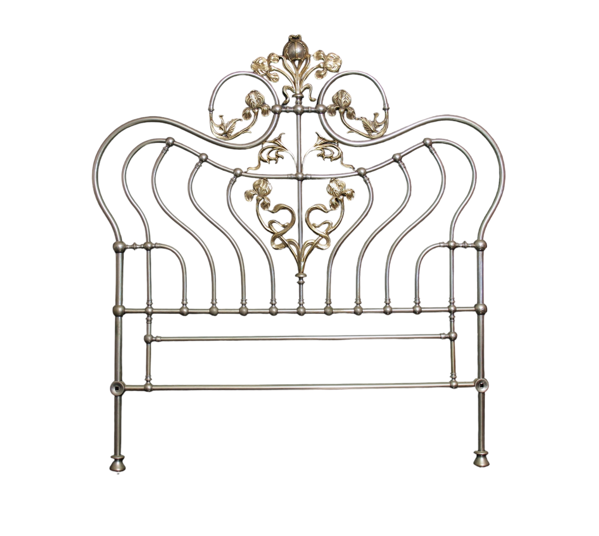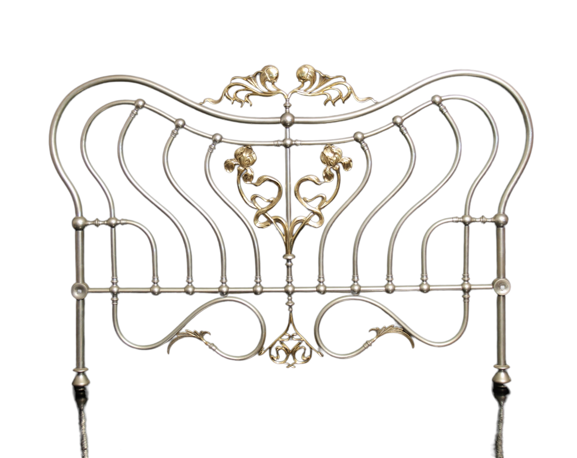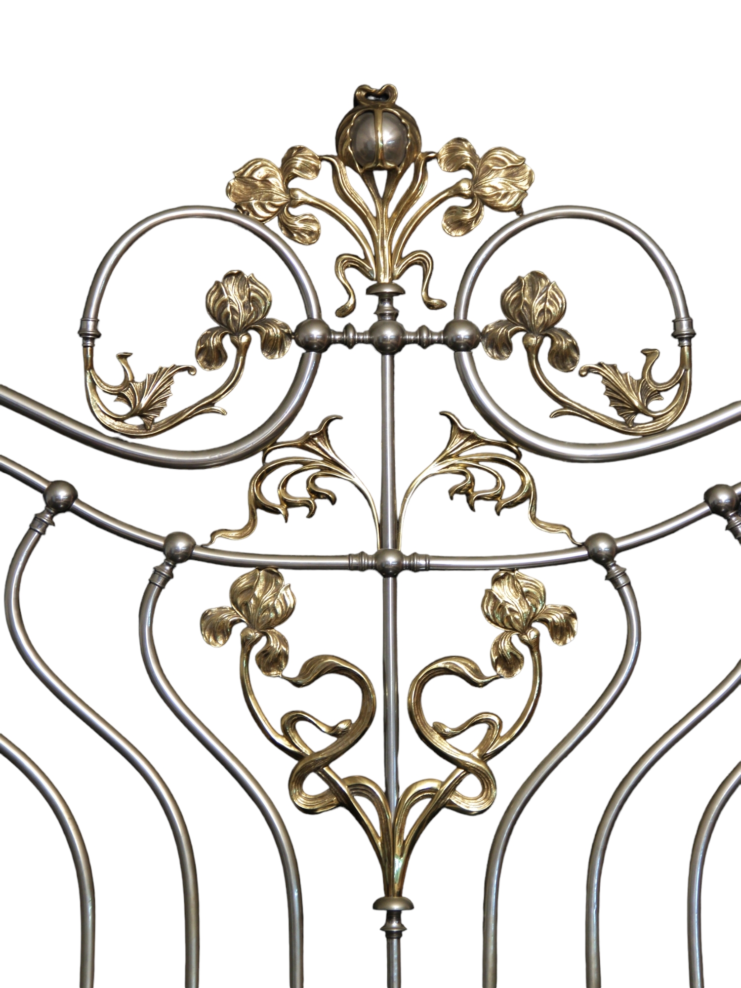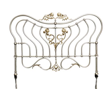 IMPORTANTE LETTO LIBERTY in alpacca decorato da fusioni di bronzo dorato a soggetti floreali rappresentativi del periodo di appartenenza primi 900 Sicilia h cm 207 x 194 / h cm 131 x 194