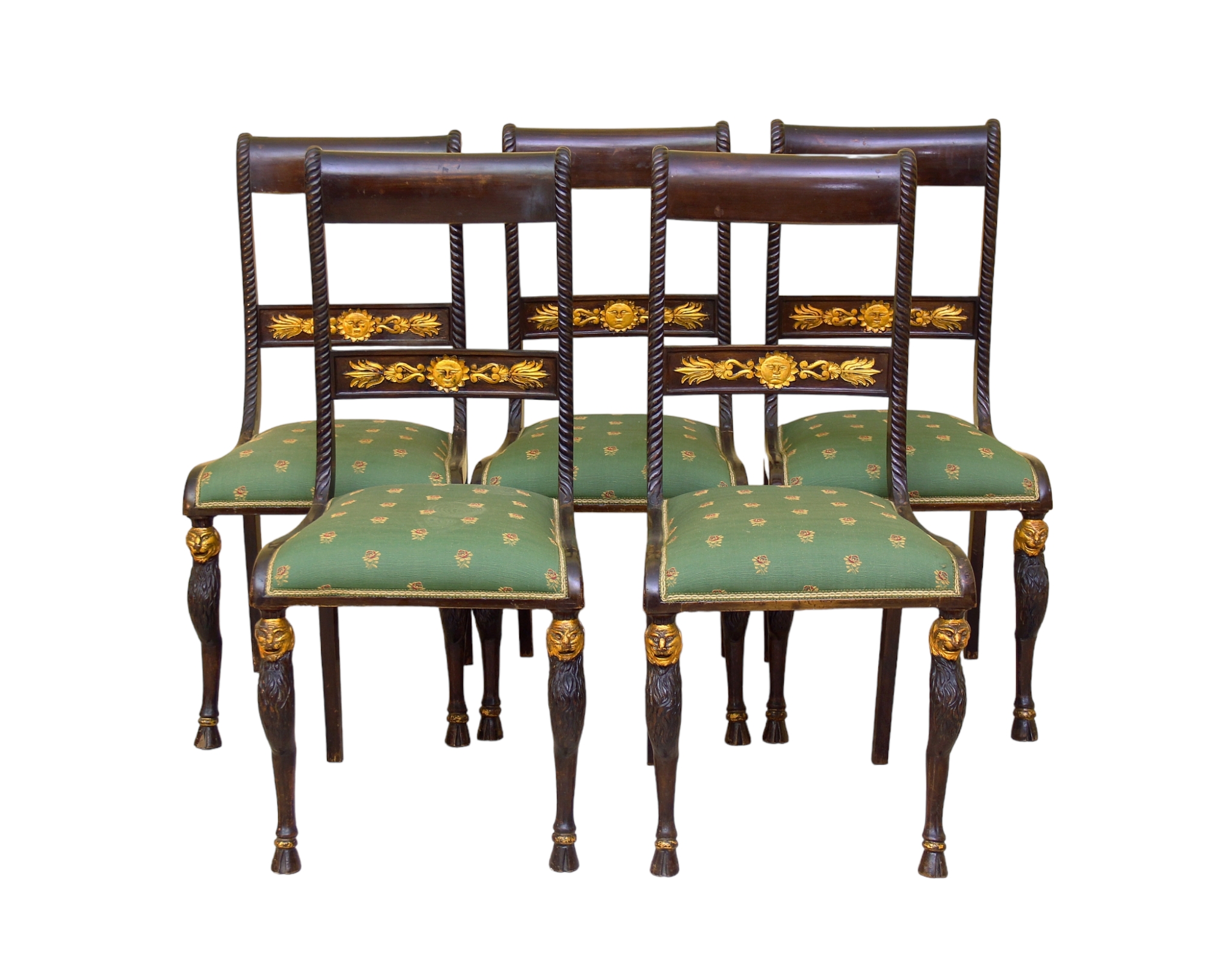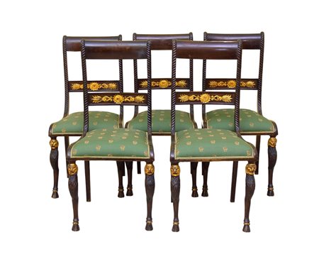 LOTTO DI 5 SEDIE in mogano con lumeggiature dorate gambe caprine e seduta imbottita XX secolo Sicilia h cm 97 x 44 x 40