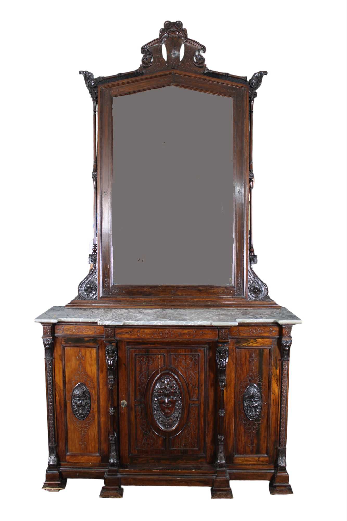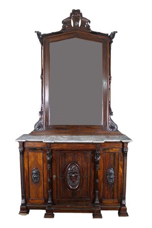 ETAGERE A TRE SPORTELLI in palissandro scolpito raffigurante profili fantastici con specchiera, piano in marmo grigio Sicilia XIX secolo h cm 290 x 151 x 48
