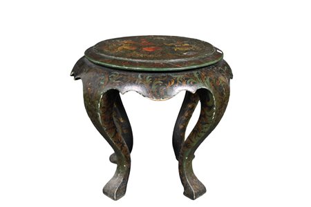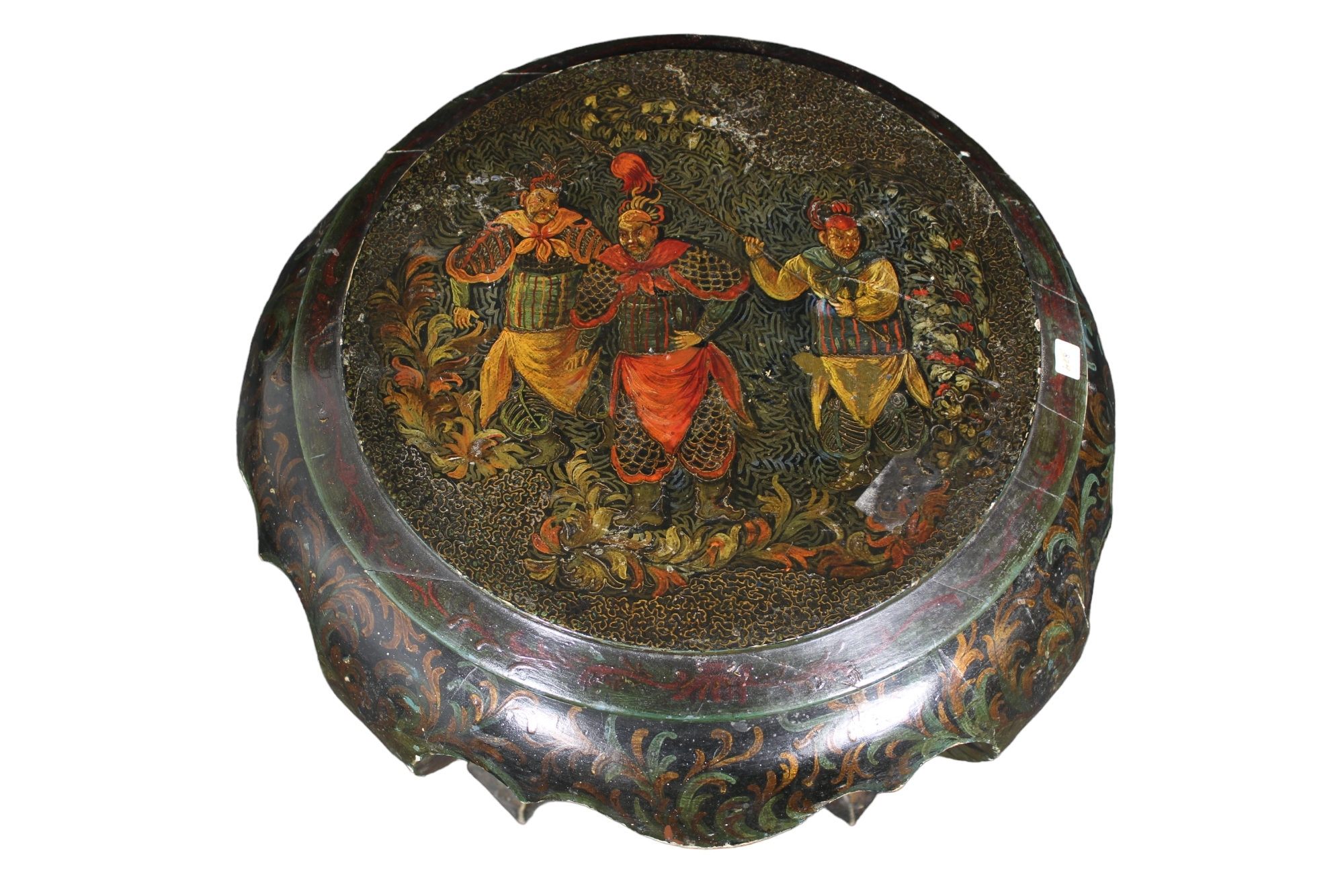 TAVOLINO in legno laccato riccamente dipinto a motivi orientali sul piano raffigura soldati manifattura asiatica XIX secolo h cm 49 x 53