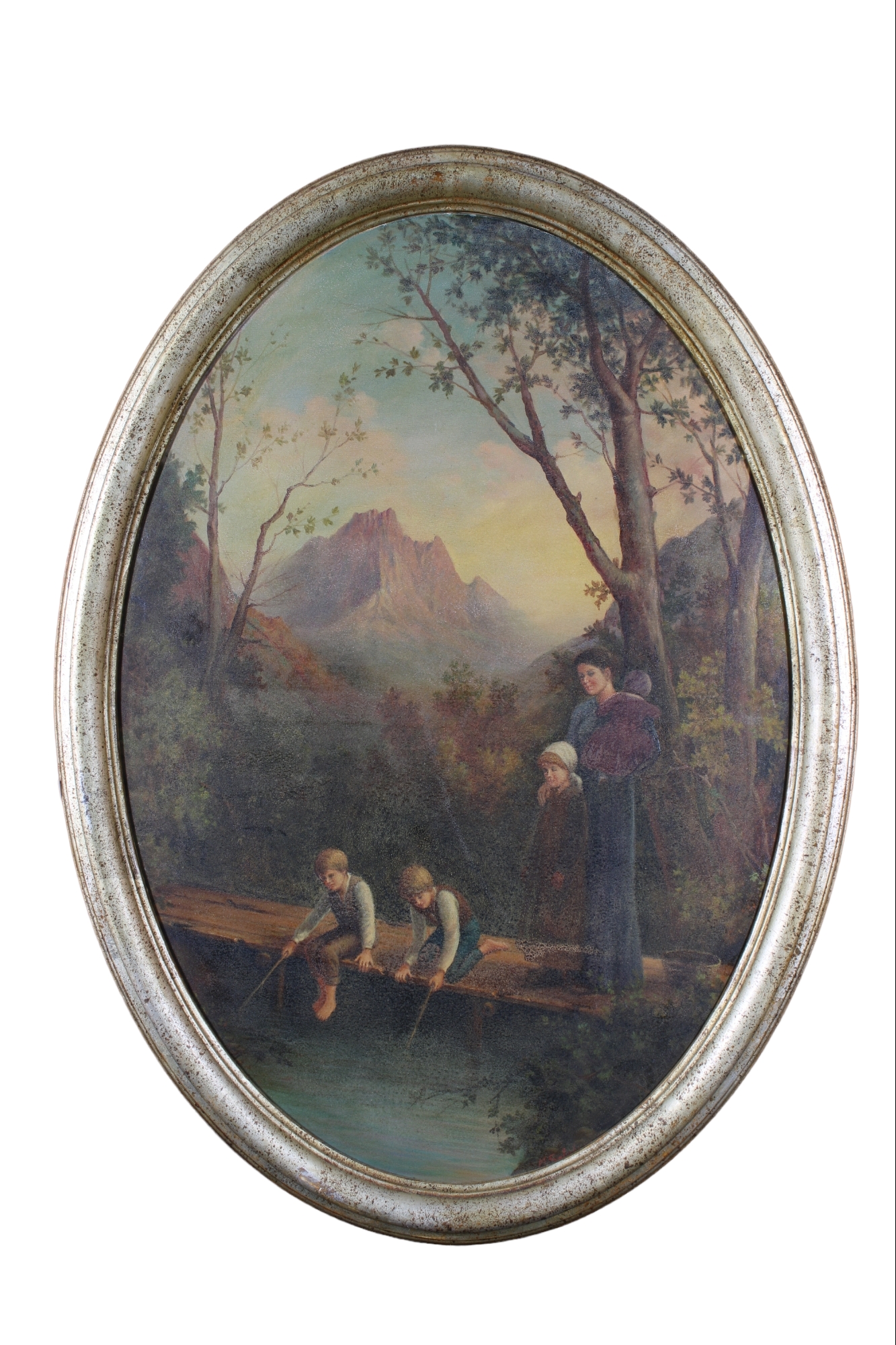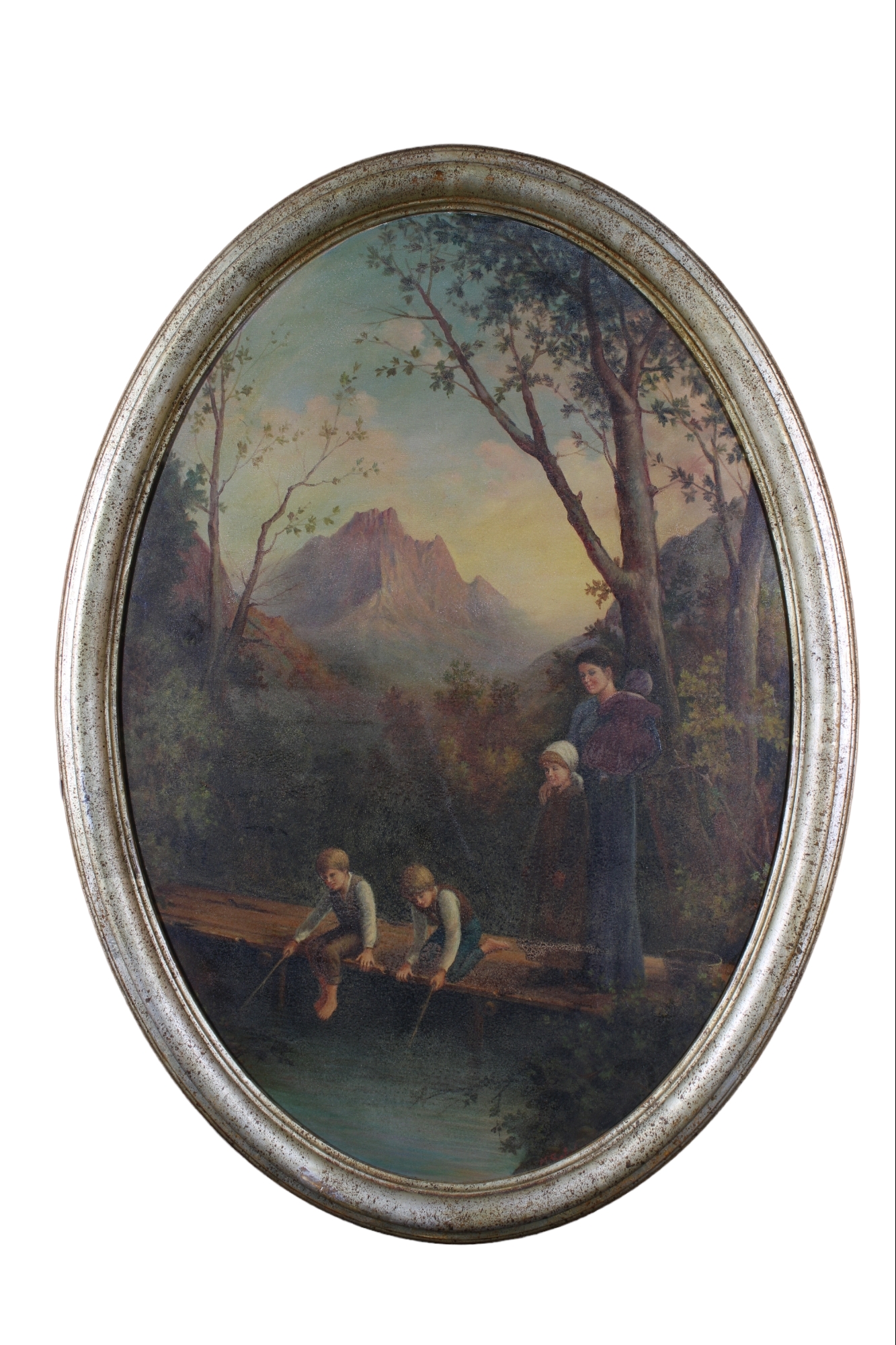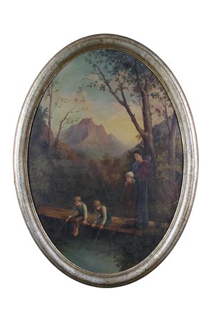OLIO SU TELA DI FORMA OVALE raffigurante la pesca al fiume scuola inglese XX secolo h cm 100 x 70 / cornice h cm 113 x 82