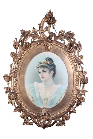 CORNICE in legno riccamente intagliata a motivi floreali e dorata contenente stampa colorata raffigurante Nobildonna Inghilterra XIX secolo h cm 46 x 36 / cornice h cm 98 x 69