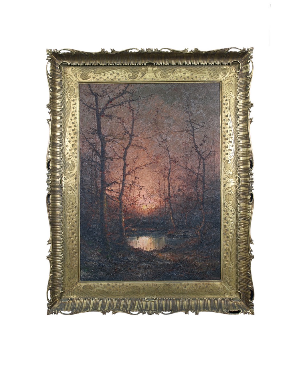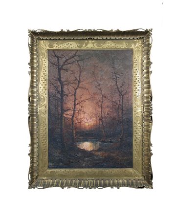 OLIO SU TELA Raffigurante Foresta notturna dentro cornice in legno dorato XX secolo h cm 70 x 50 / cornice h cm 91 x 72