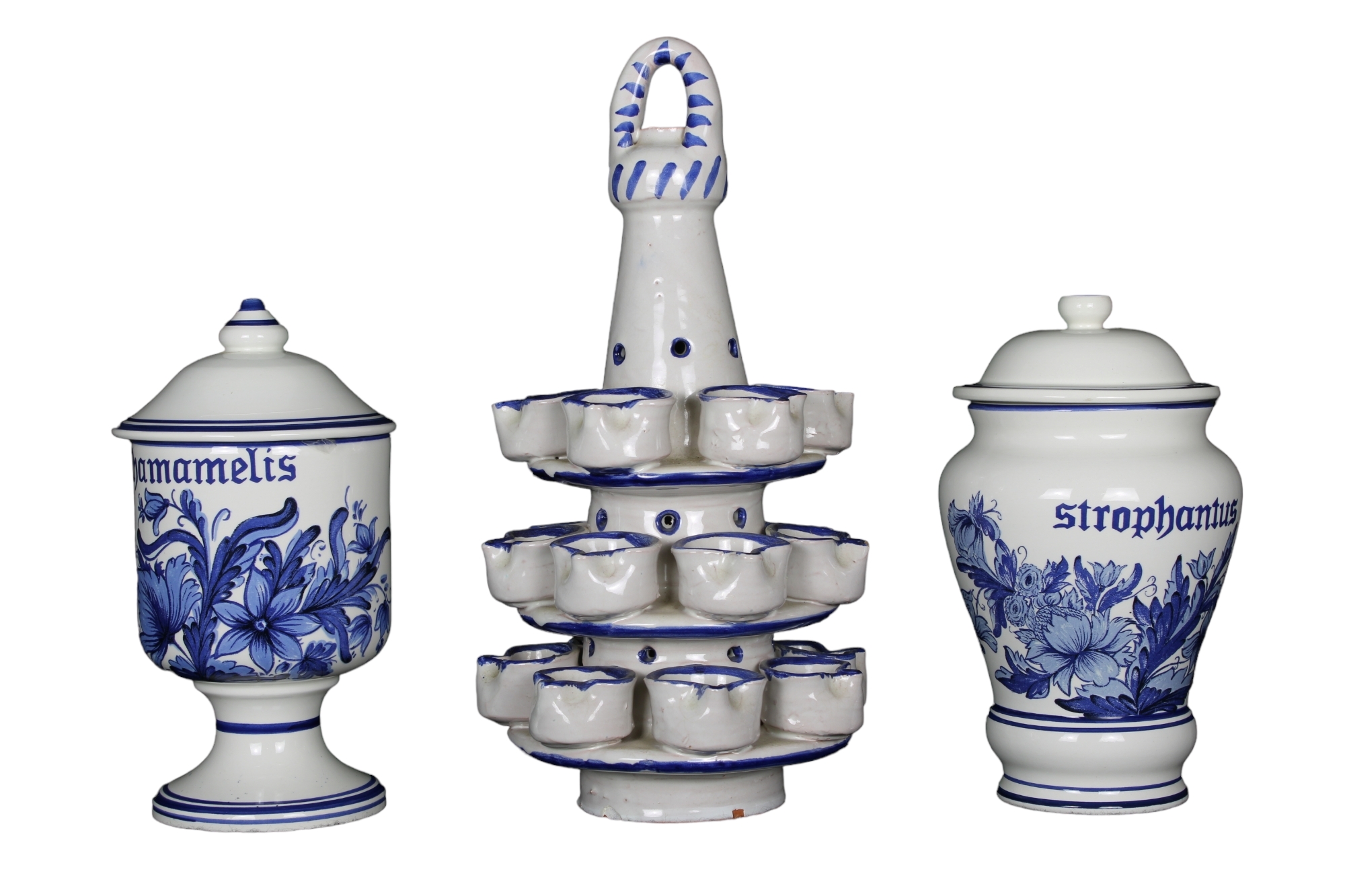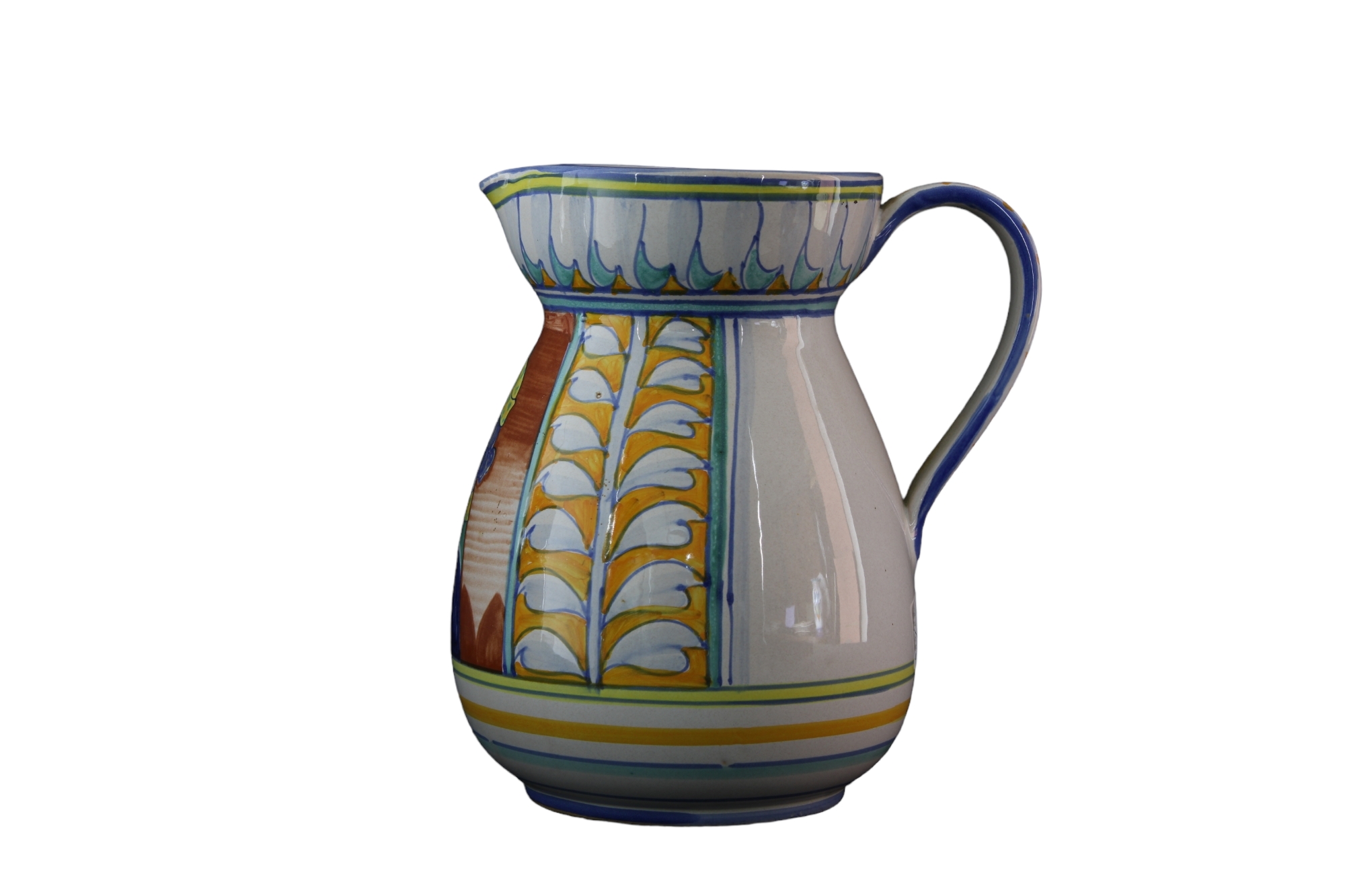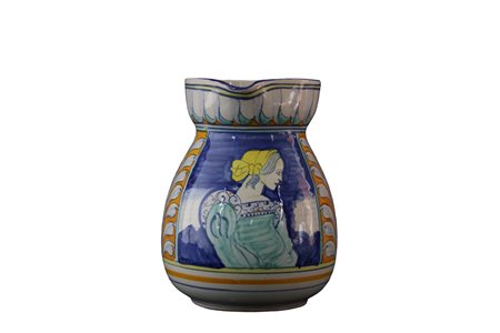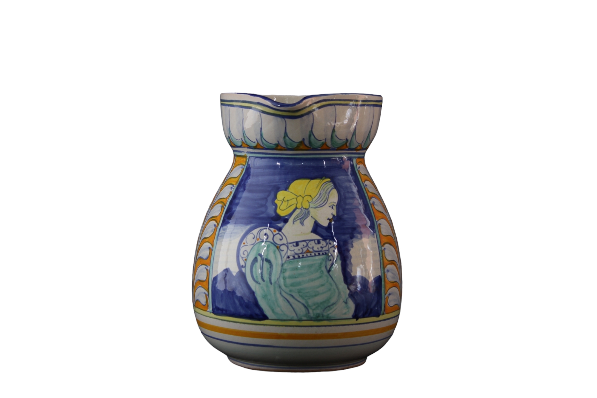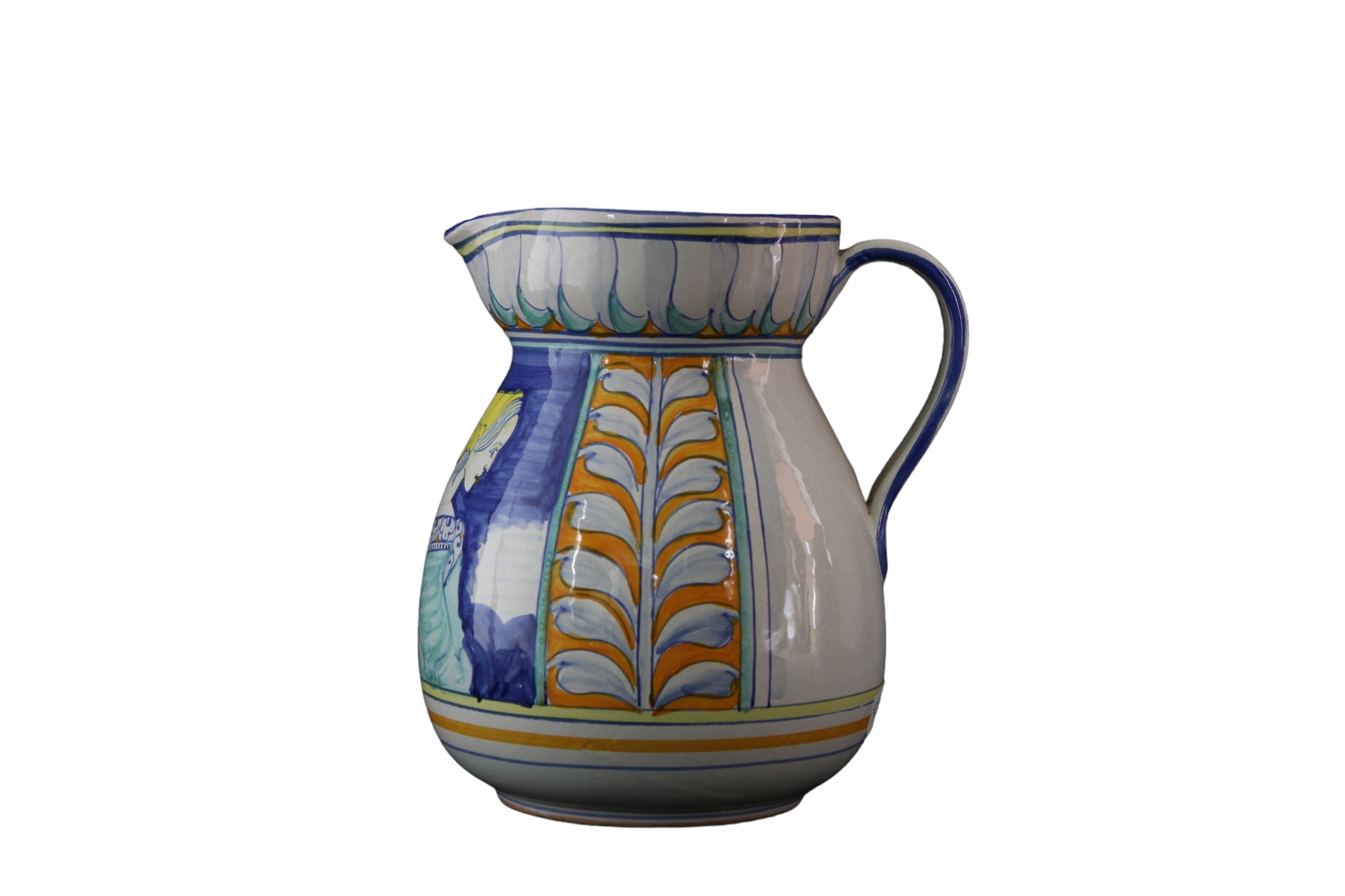 2 CARAFFE in maiolica, marcate antica Deruta 1 LUMIERA in maiolica e 2 VASI DA FARMACIA in porcellana dipinta misure varie