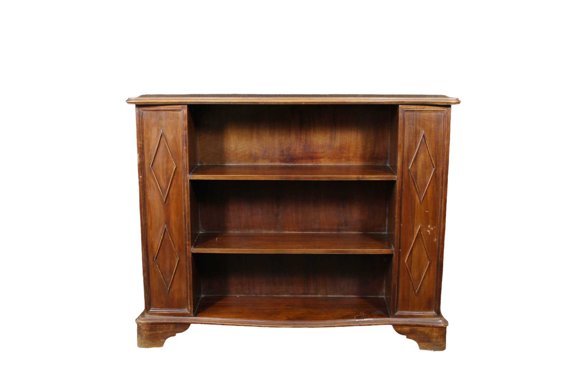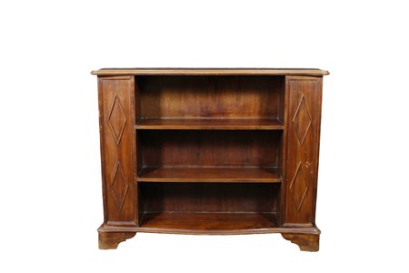 PICCOLA CREDENZA in noce con pinti decorati da rilievi a rombi e due mensole a giorno maestranze siciliane XX secolo h cm 82 x 117 x 27,5