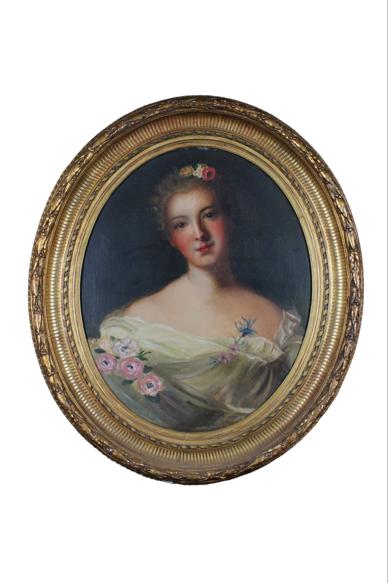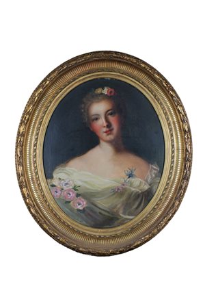 OLIO SU TELA DI FORMA OVALE Raffigurante figura femminile dentro cornice in legno dorato scuola italiana XIX secolo h cm 60 x 50 / cornice h cm 80 x 70