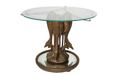 TAVOLINO con piano in vetro, sorretto da scultura in legno raffigurante Cigni vecchia fattura h cm 51 x Ø 65