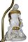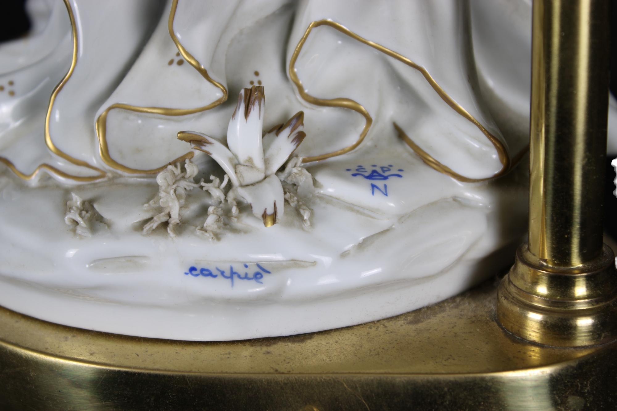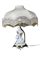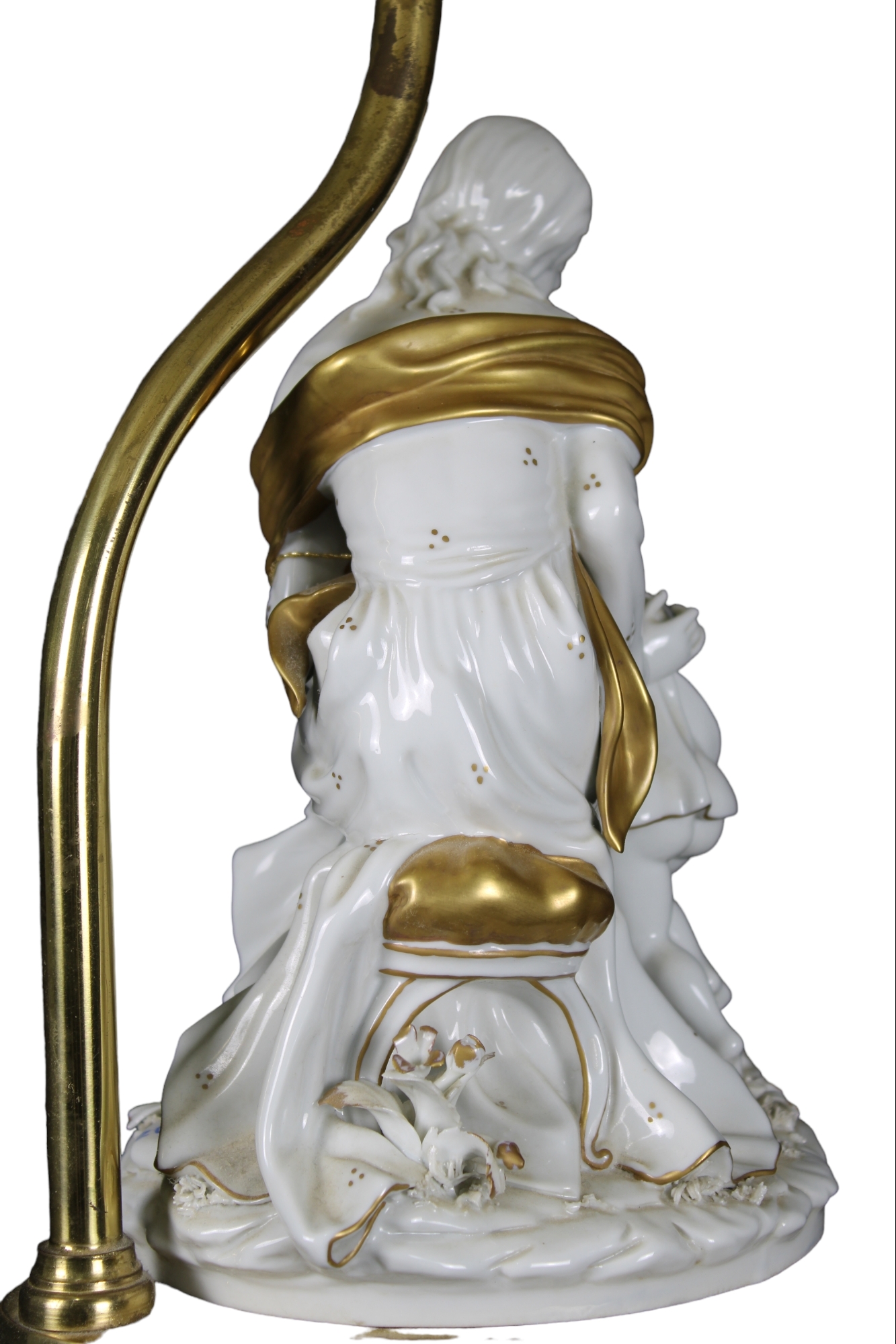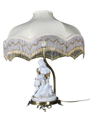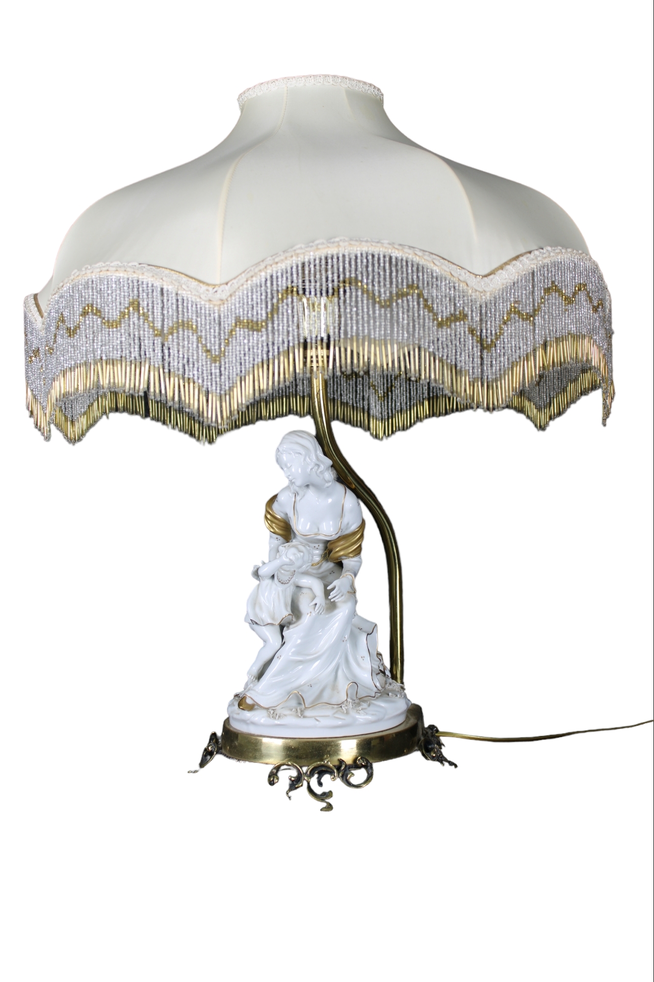 LAMPADA DA TAVOLO in porcellana bianca e lumeggiature in oro raffigurante donna con bambina montata su base in metallo, paralume in tessuto con pendenti in perline di vetro reca marchio N coronata manifattura Capodimonte XX secolo h cm 56 x 45