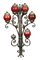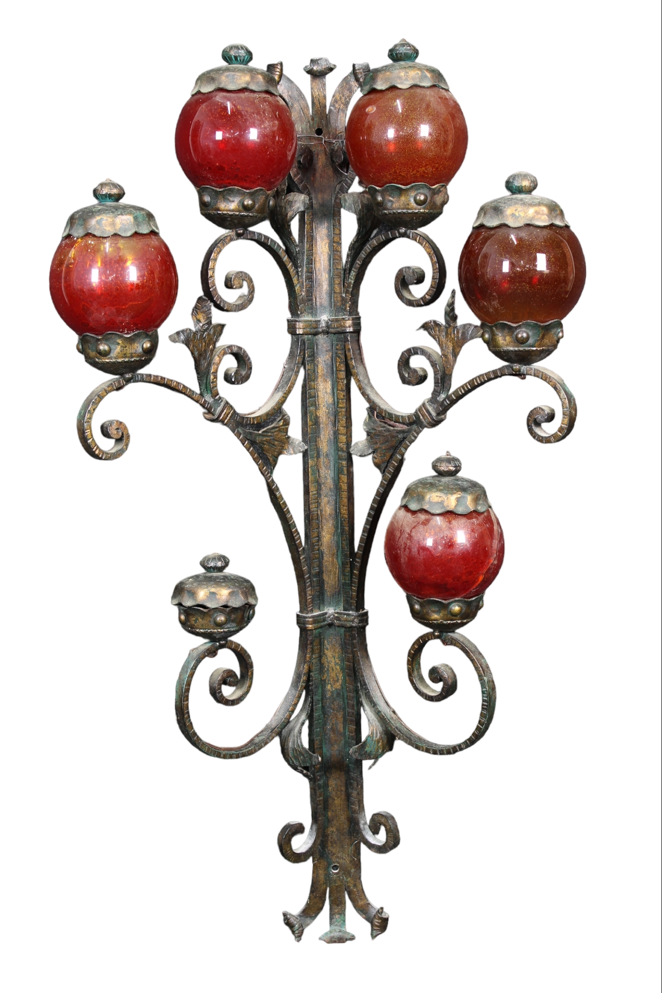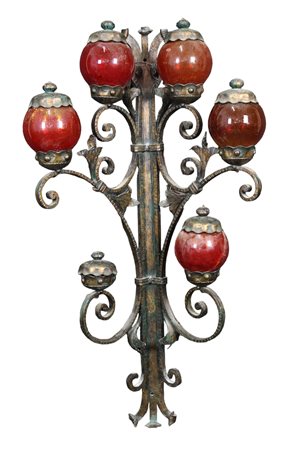 GRANDE APPLIQUES in ferro battuto a 6 luci con bocce in vetro soffiato rosso, una rotta, una mancante manifattura Siciliana XX secolo h cm 124 x 61 x 35