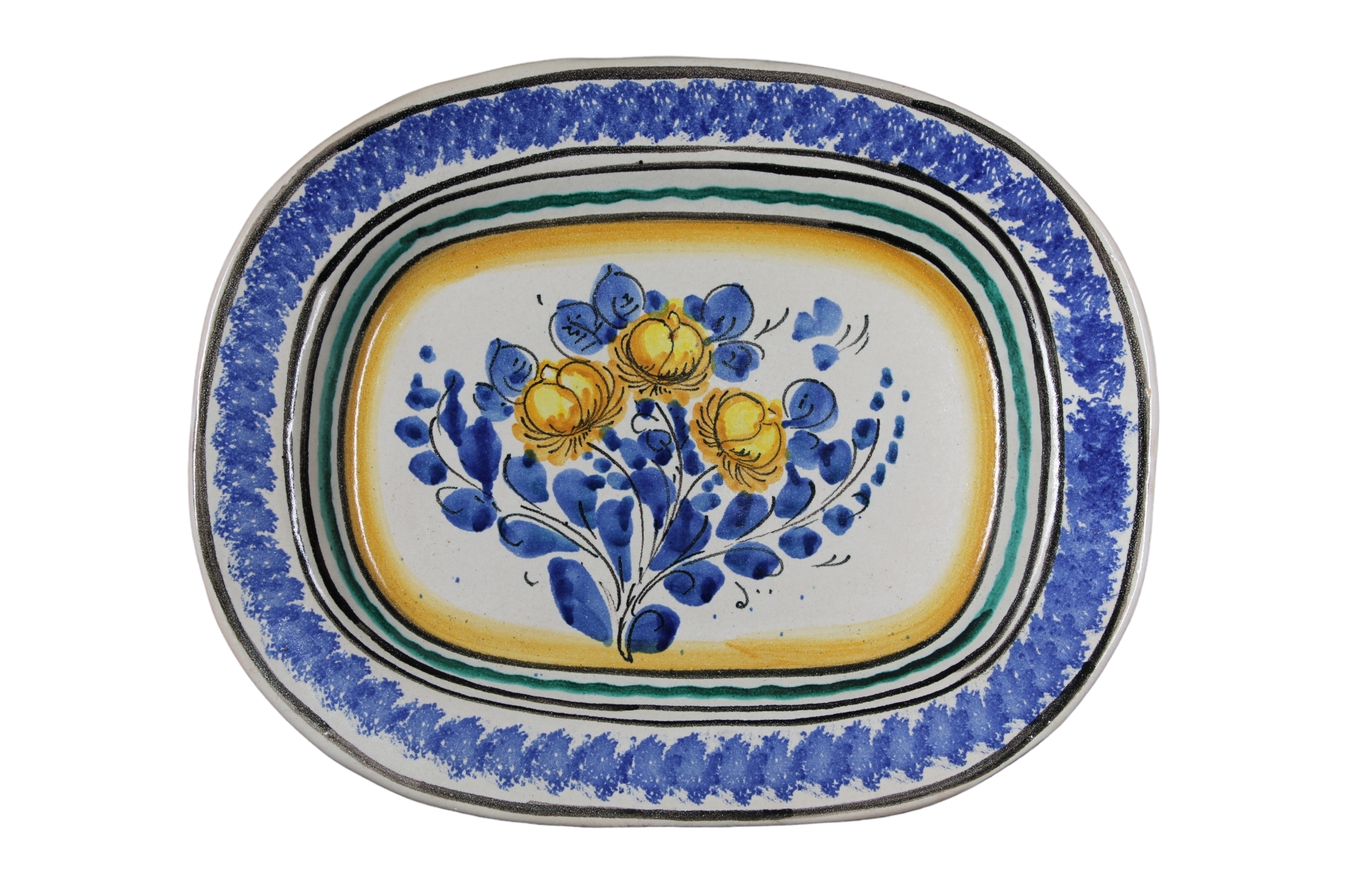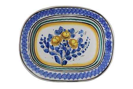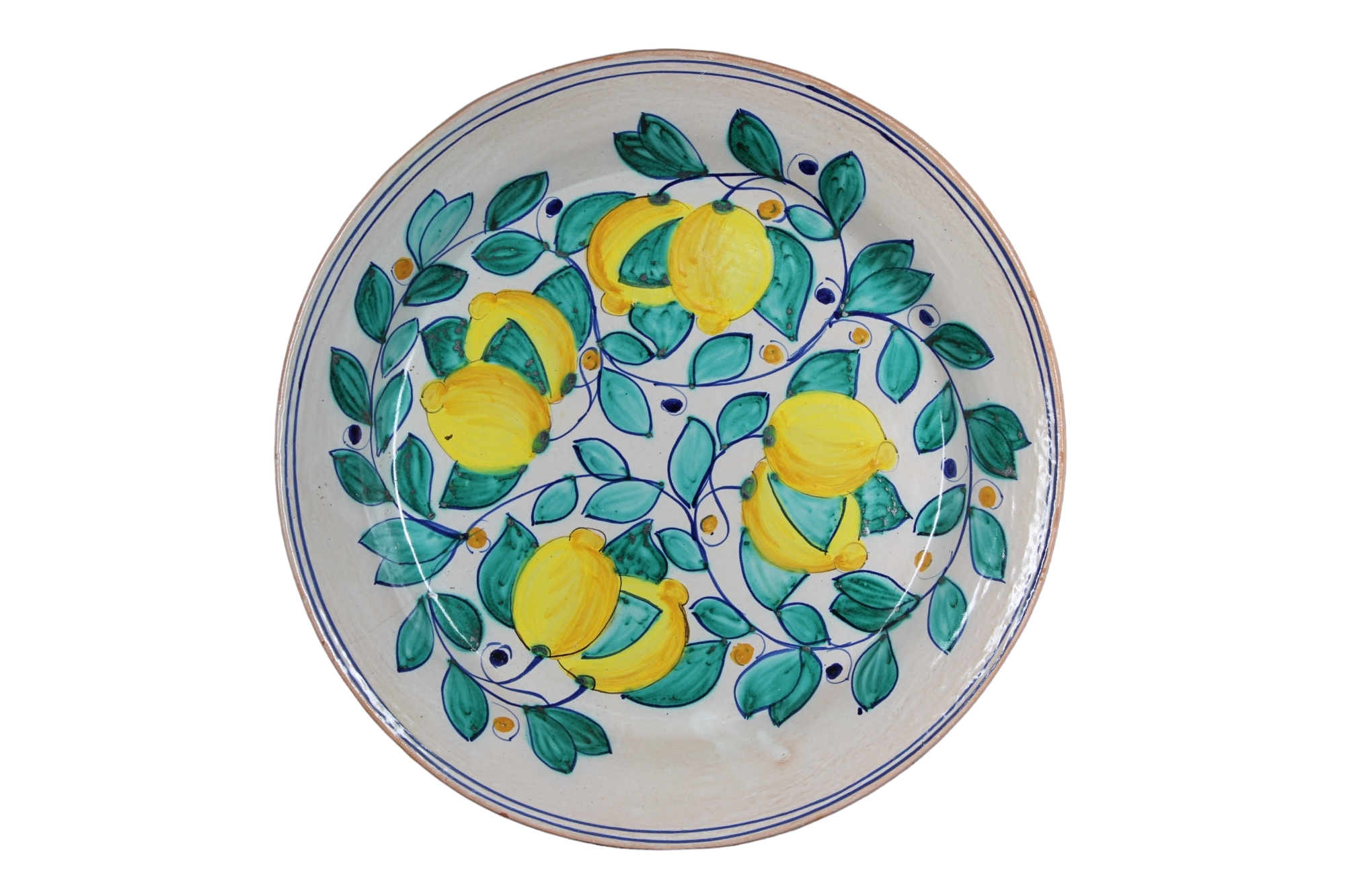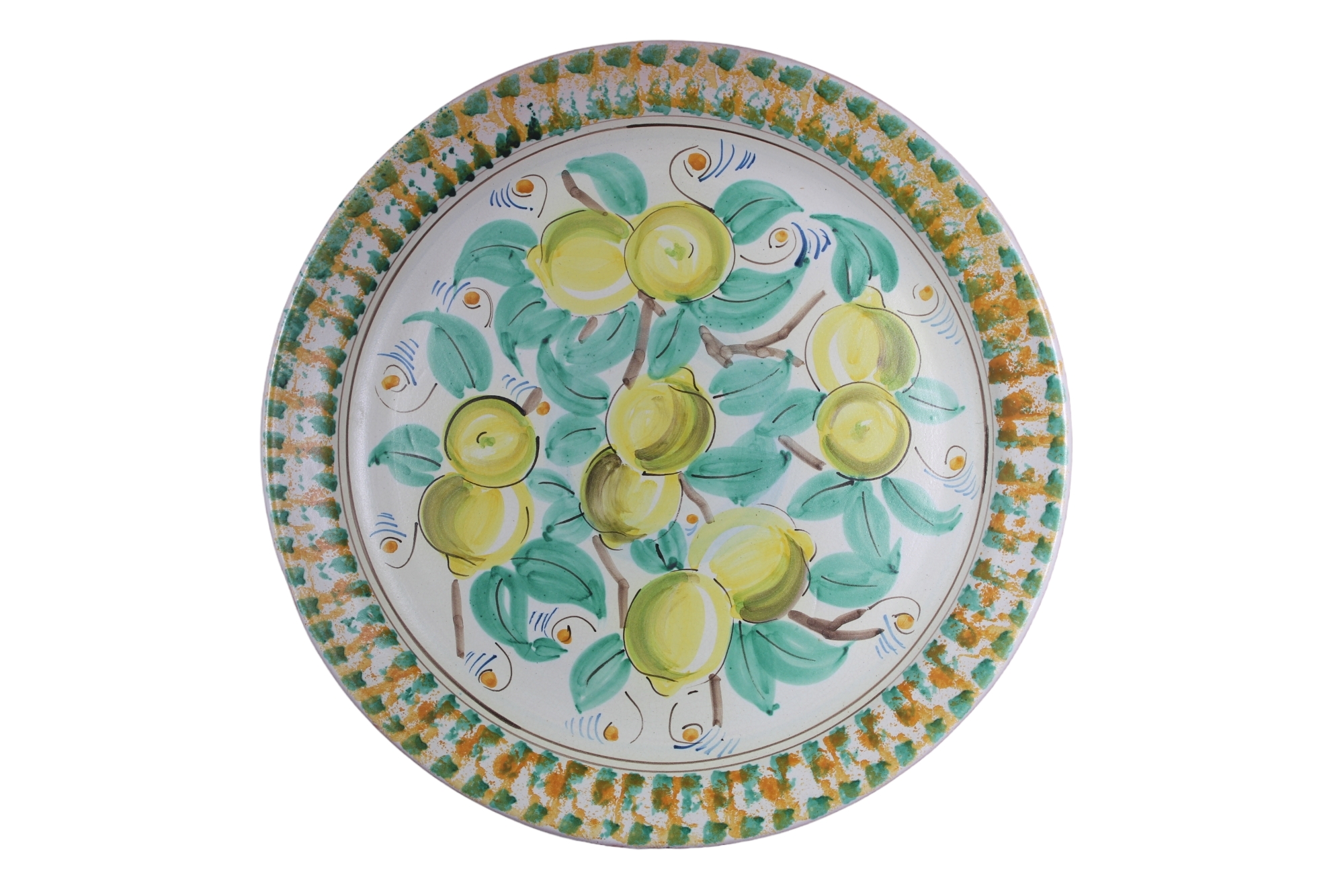 3 PIATTI DA PORTATA in maiolica, decorati da frutti vecchia fattura Caltagirone h cm 43 x 35 / Ø 36 / Ø 44