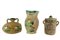 GRUPPO DI 3 OGGETTI in maiolica di cui: 1 CONTENITORE CILINDRICO CON COPERCHIO, 1 VERSATOIO E 1 FIASCA vecchia fattura Caltagirone h cm 14 x 11 / h cm 21 x 15 / h cm 16,5 x 15