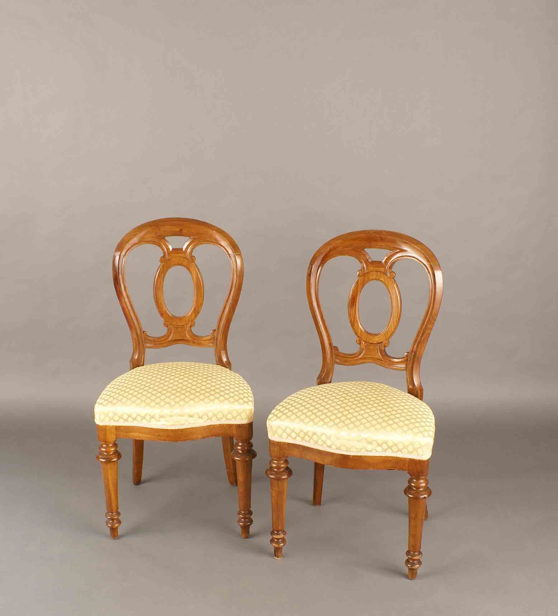 Cinque sedie in mogano, schienale traforato, seduta imbottita e rivestita in tessuto poggiante su gambe tornite, vecchia manifattura, h. cm. 88.