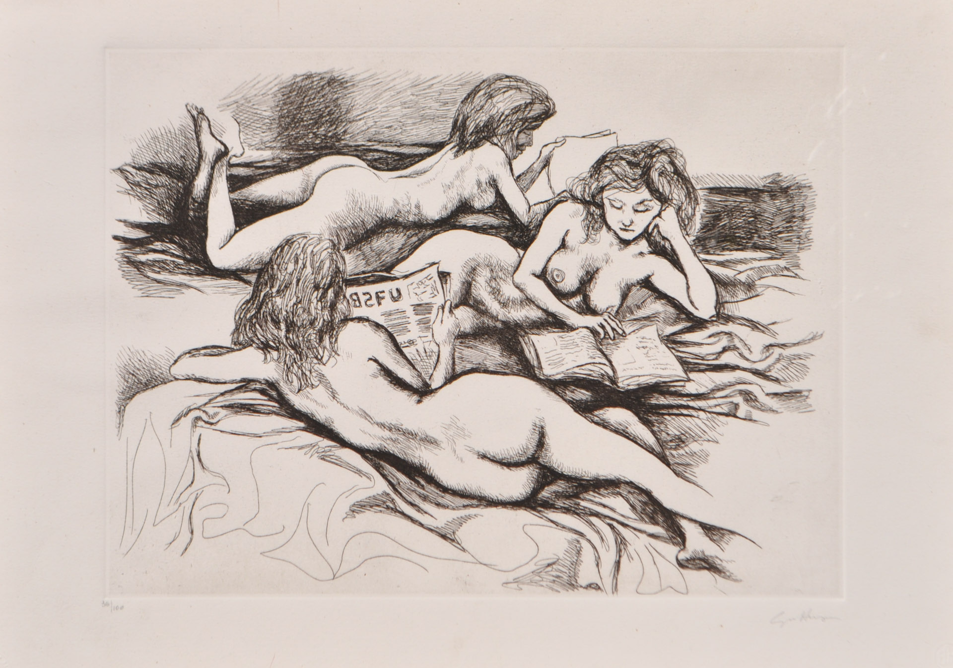 Renato Guttuso (Bagheria 1911 - Rom/Roma 1987) Nude in lettura;Acquaforte su carta, 36,5 x 50 cm, timbro a