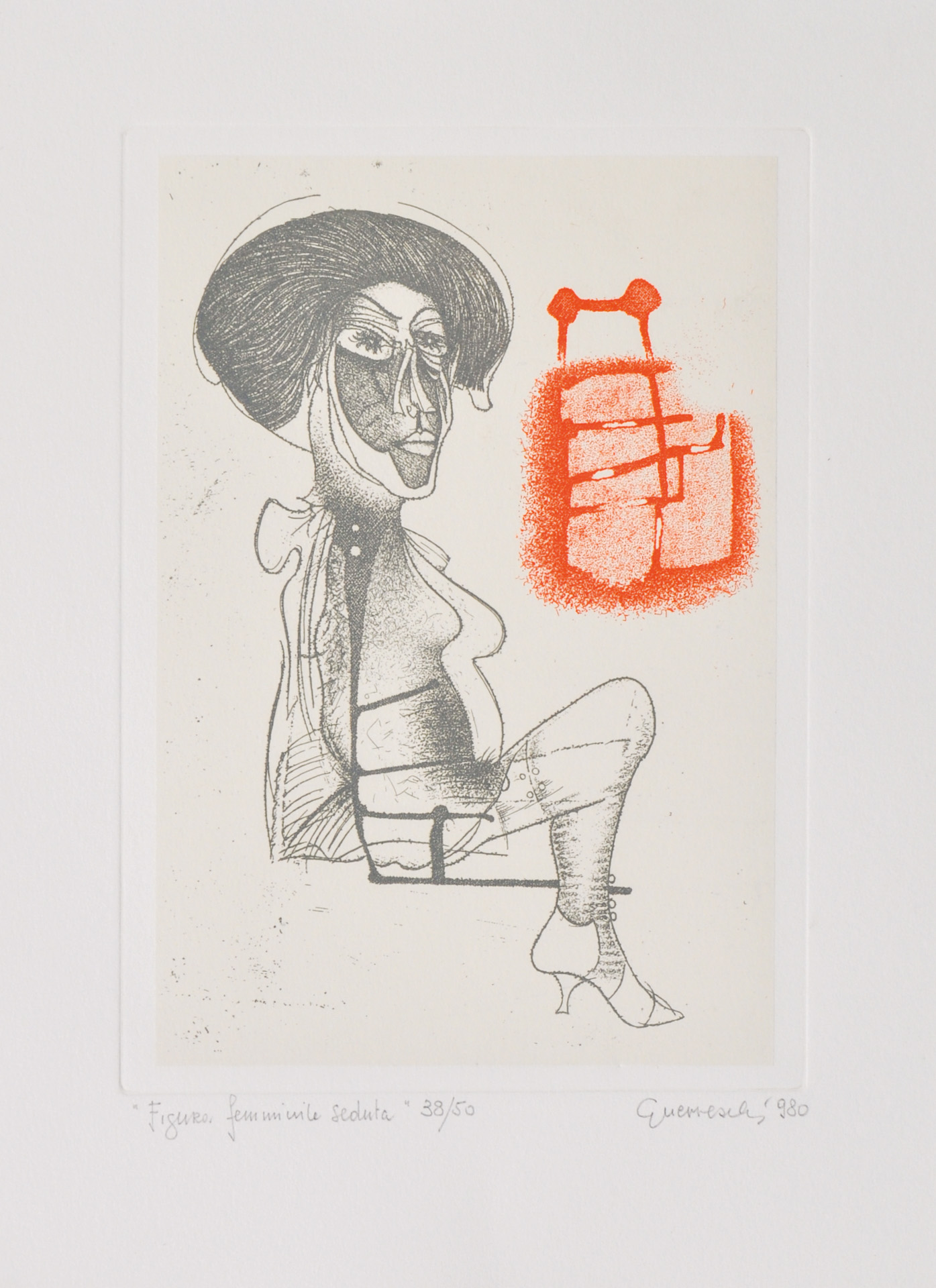 Giuseppe Guerreschi (Mailand/Milano 1929 - Nizza 1985) Figura femminile seduta, 1980;Acquaforte a col. su carta, 24,5 x 17,5 cm