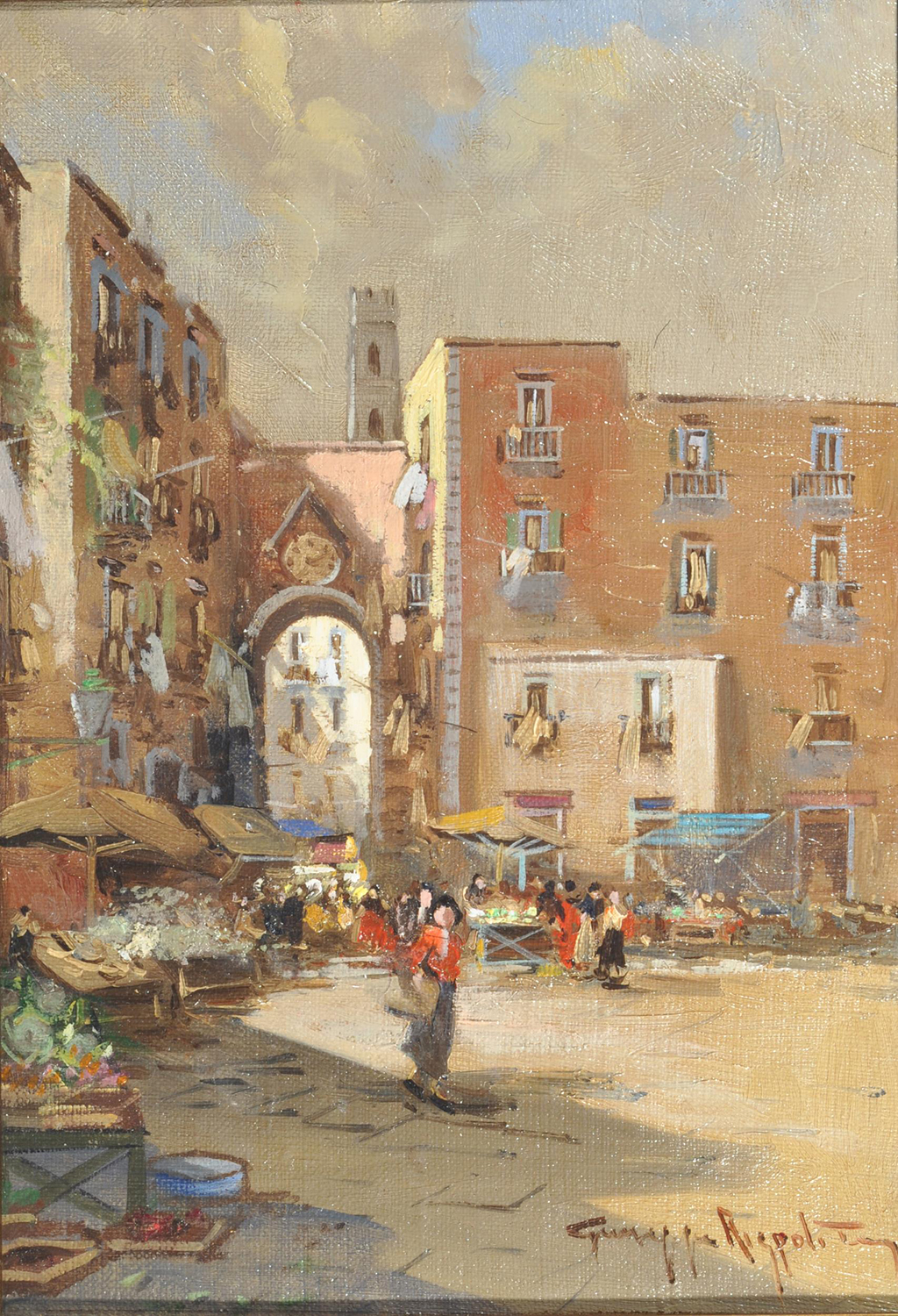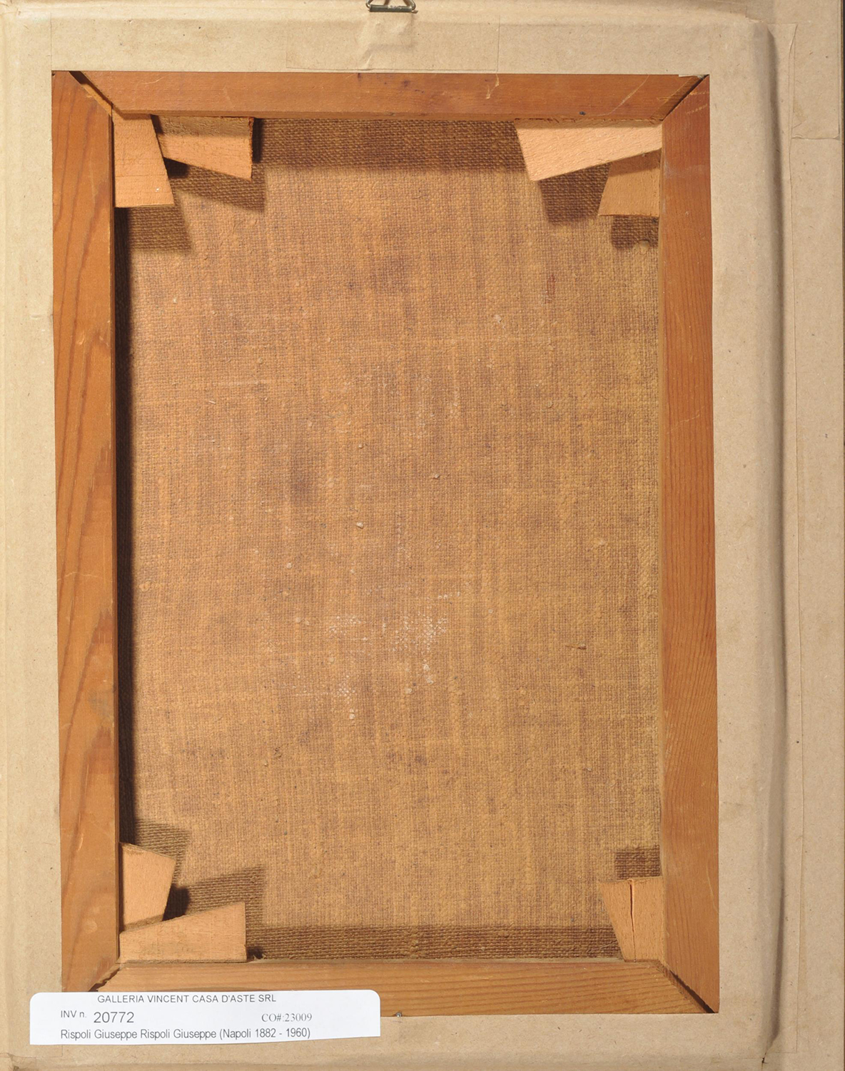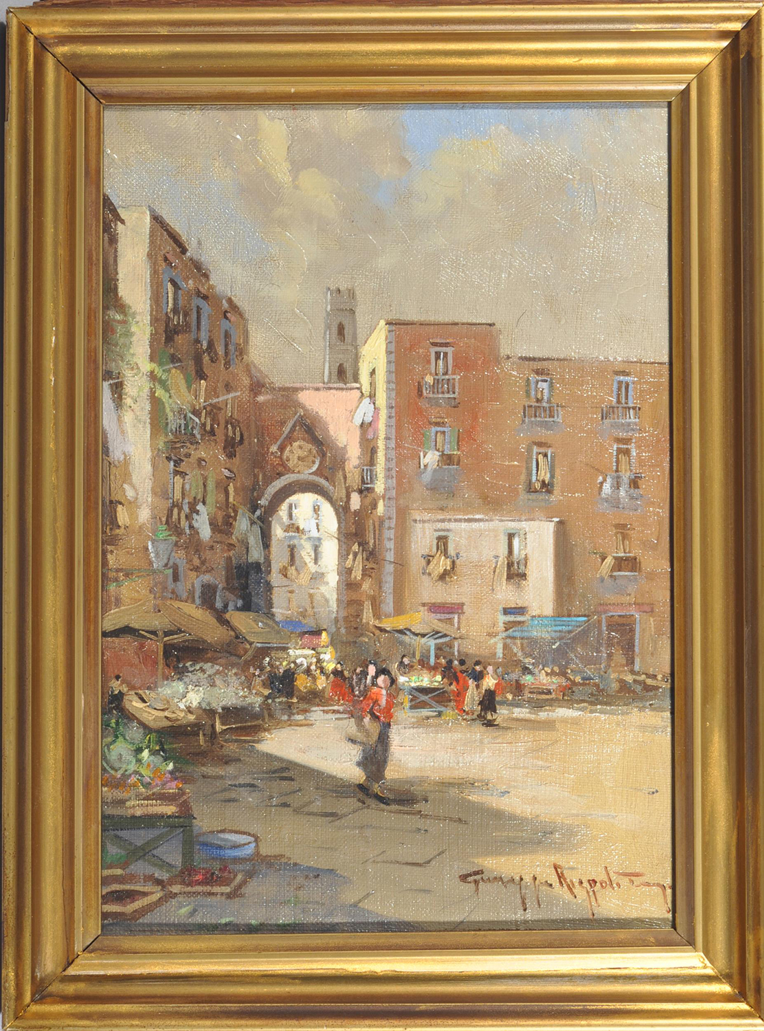 Rispoli Giuseppe (Napoli 1882 - 1960) Mercato olio su tela, cm 30x22 firmato e iscritto in basso a destra: Giuseppe Rispoli Napoli