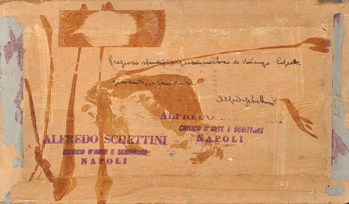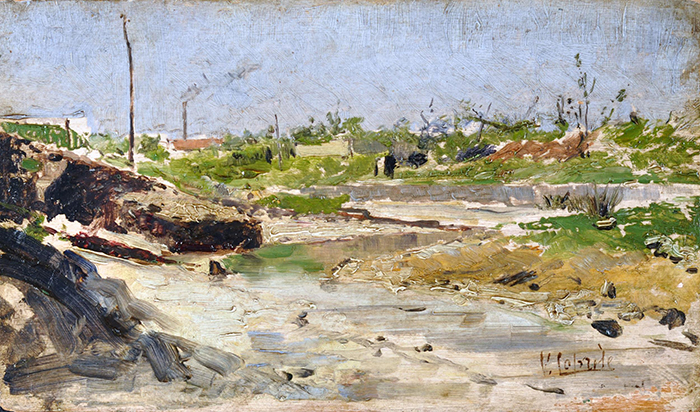 Caprile Vincenzo (Napoli 1856 - 1936) Paesaggio olio su tavola, cm 10,5x17,8 firmato in basso a destra: V. Caprile a tergo autentica di Alfredo Schettini