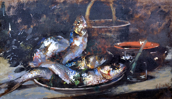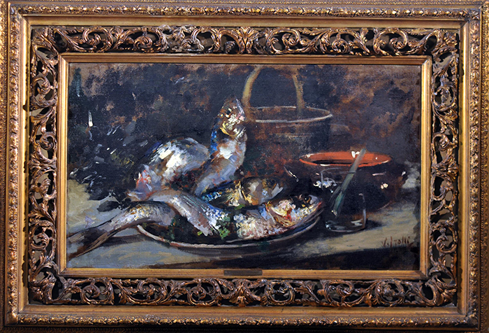 Irolli Vincenzo (Napoli 1860 - 1949) Natura morta con pesci olio su tela, cm 55x95 firmato in basso a destra: V. Irolli