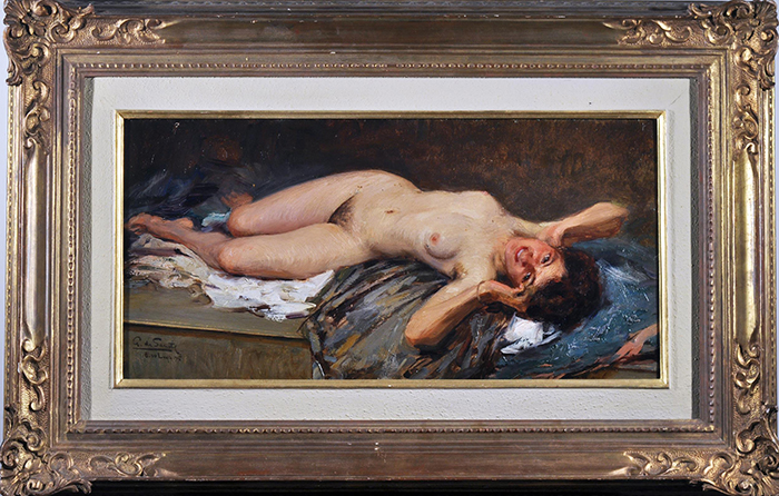 de Sanctis Giuseppe (Napoli 1858 - 1924) Nudo di donna sdraiata olio su tavola, cm 24,6x50,1 firmato e datato in basso a sinistra: G. de Sanctis 8-10 Luglio 1915 a tergo cartiglio: Coll. Arch. Paolo Candiani