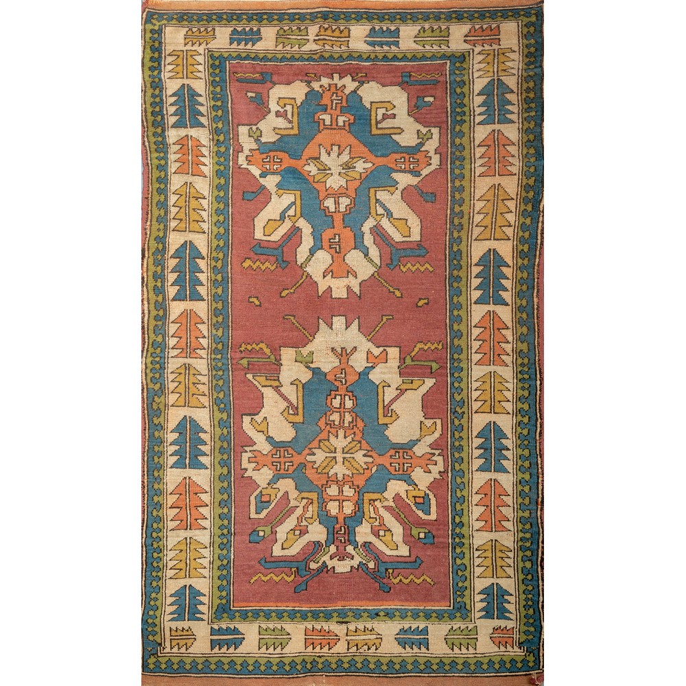 Tappeto Kazak, trama ed ordito in cotone, vello in lana (strappi ed usure).