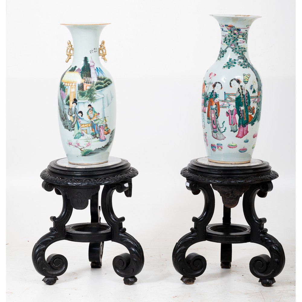 Coppia di vasi in porcellana policroma decorata con figure orientali, basi in legno ebanizzate con piano in marmo (un vaso presenta difetto al collo).