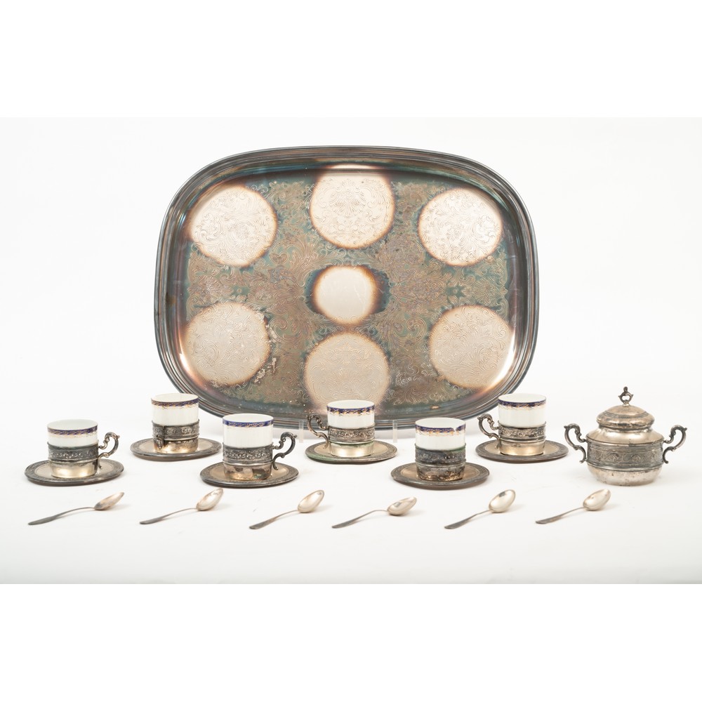 VASSOIO in sheffield con sei tazze con piattini, cucchiaini e zuccheriera in argento.