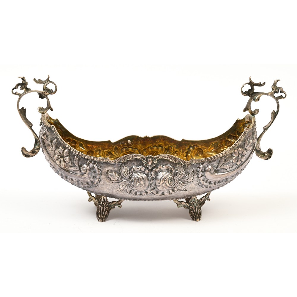 GIATTA con anse in argento 900 riccamente sbalzato a motivo floreale e fogliaceo. Reca marchio RK (g. 578).