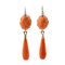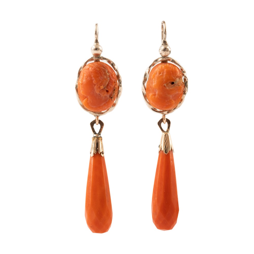 ORECCHINI pendenti in corallo sfaccettato e cabochon in corallo lavorato raffiguranti "Profili femminili", montatura in argento dorato e coppette in oro giallo 9 KT (g. 14,00).