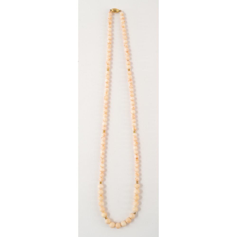COLLANA in corallo rosa a degradare, susta in oro giallo 18 KT (g. 80,70).