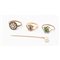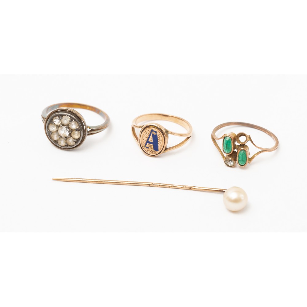 Anello in oro giallo 9 KT e argento con zirconi, anello in oro giallo 9 KT con pietre sintetiche (mancanza), spillino in oro giallo 9 KT e perla e anello in oro giallo 12 KT e smalto (usura) (g. tot. 8,10).