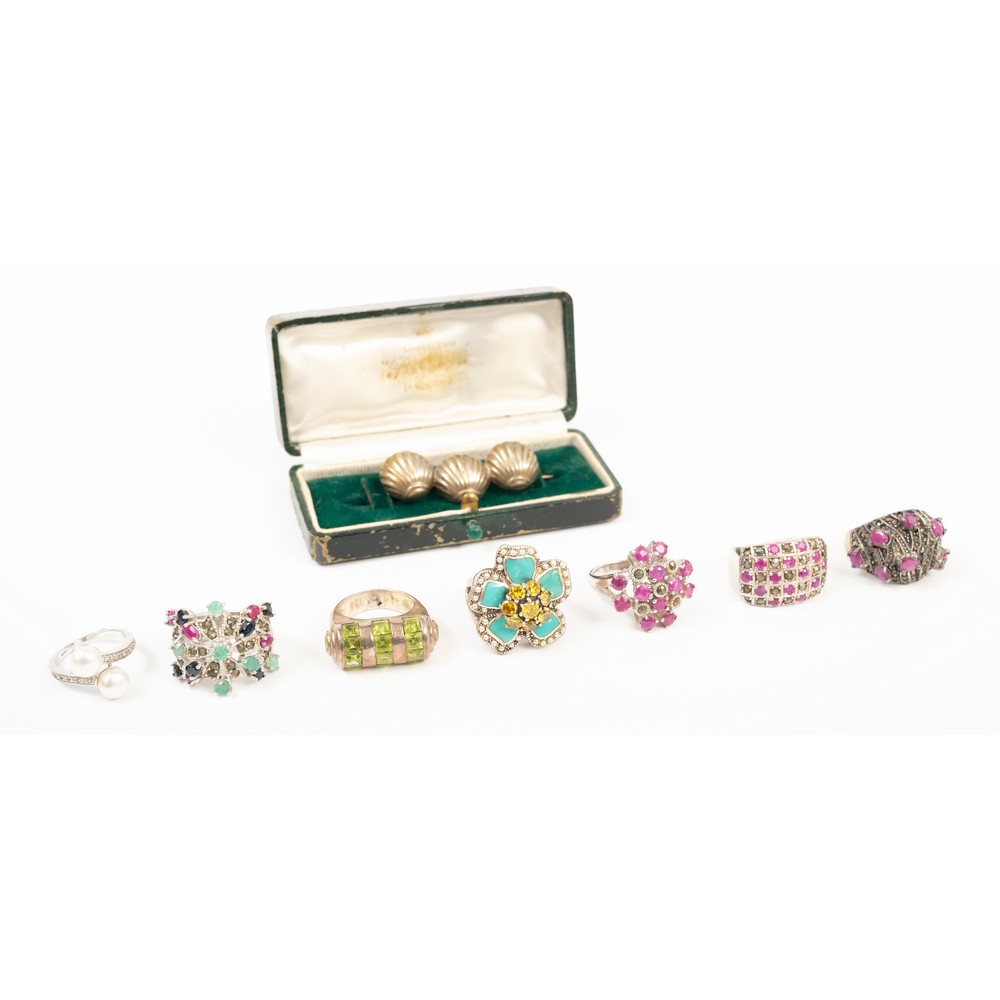 Sette anelli ed una spilla in argento e metallo.