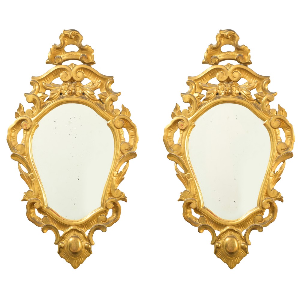 Coppia di specchiere in legno intagliato e dorato a forma di scudo.