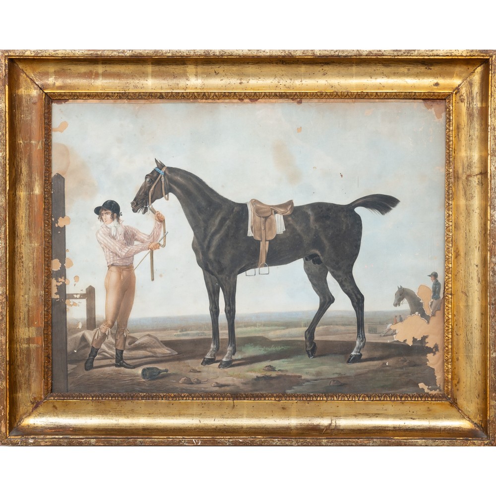 Cornice a canna ciaccata in legno dorato ad argento a mecca, con all'interno una stampa a colori raffigurante paesaggio con fantino a cavallo (usure).