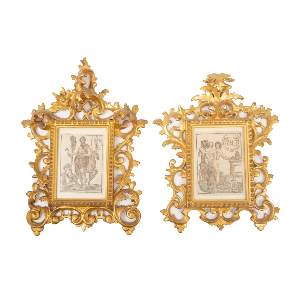 COPPIA PICCOLE CORNICI fiorentine in legno intagliato ad oro zecchino con incisioni del XVII secolo raffiguranti "Figure mitologiche".