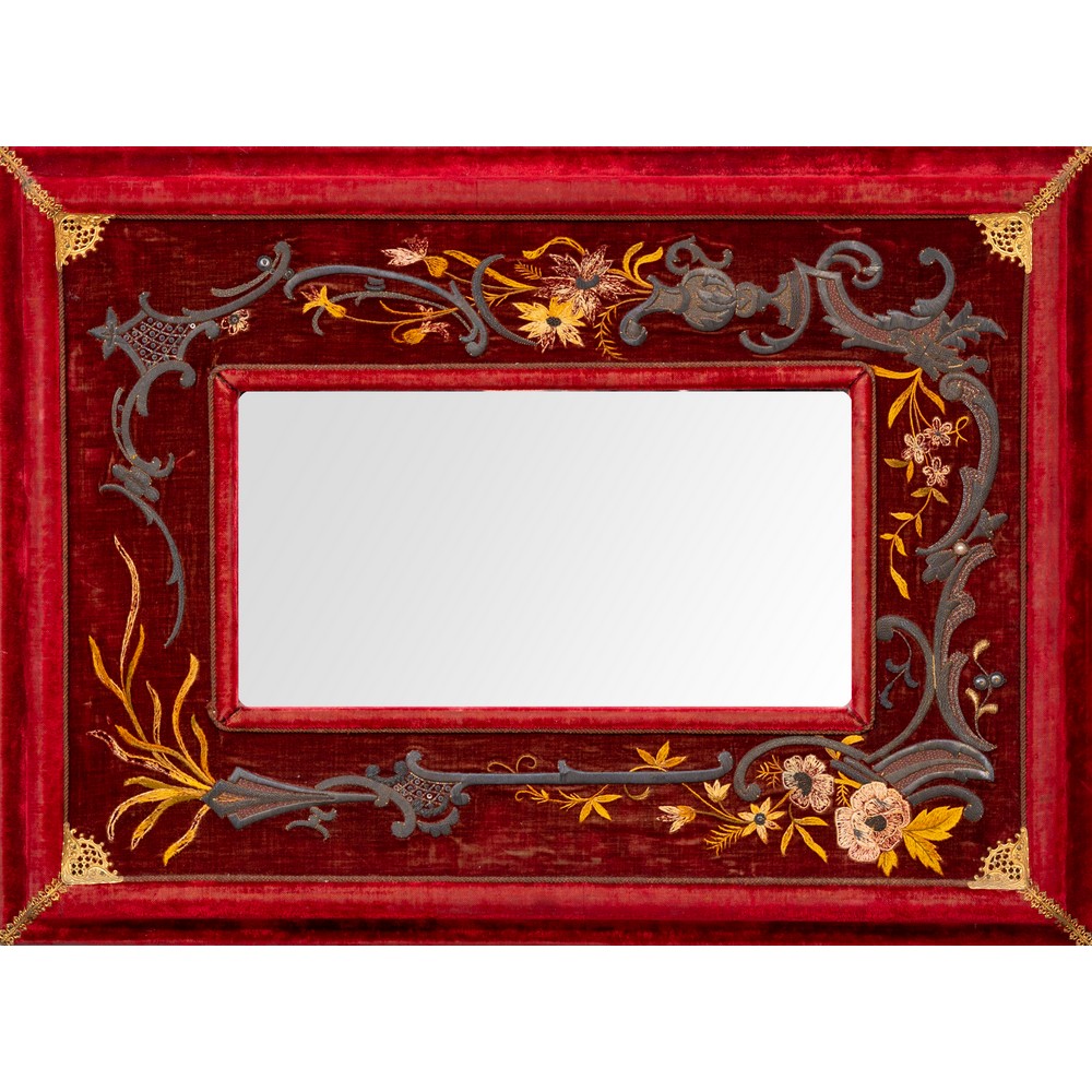 Specchiera rivestita con tessuto e disegni ricamati a mano e Cornice in legno dorato.