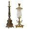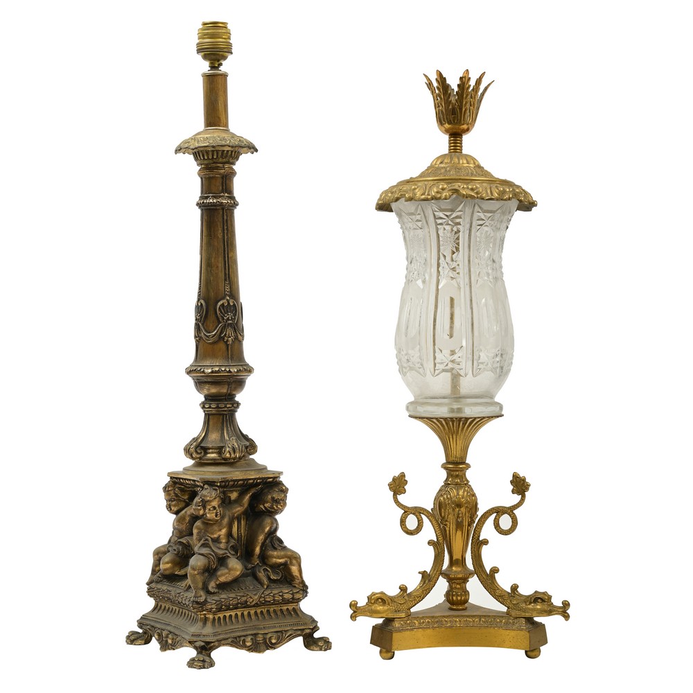 DUE LAMPADE in ottone, una con base scolpita e l'altra con tulipe in vetro.