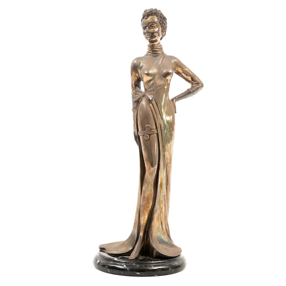 SCULTURA in lamina argentata con base in marmo nero raffigurante figura femminile.