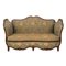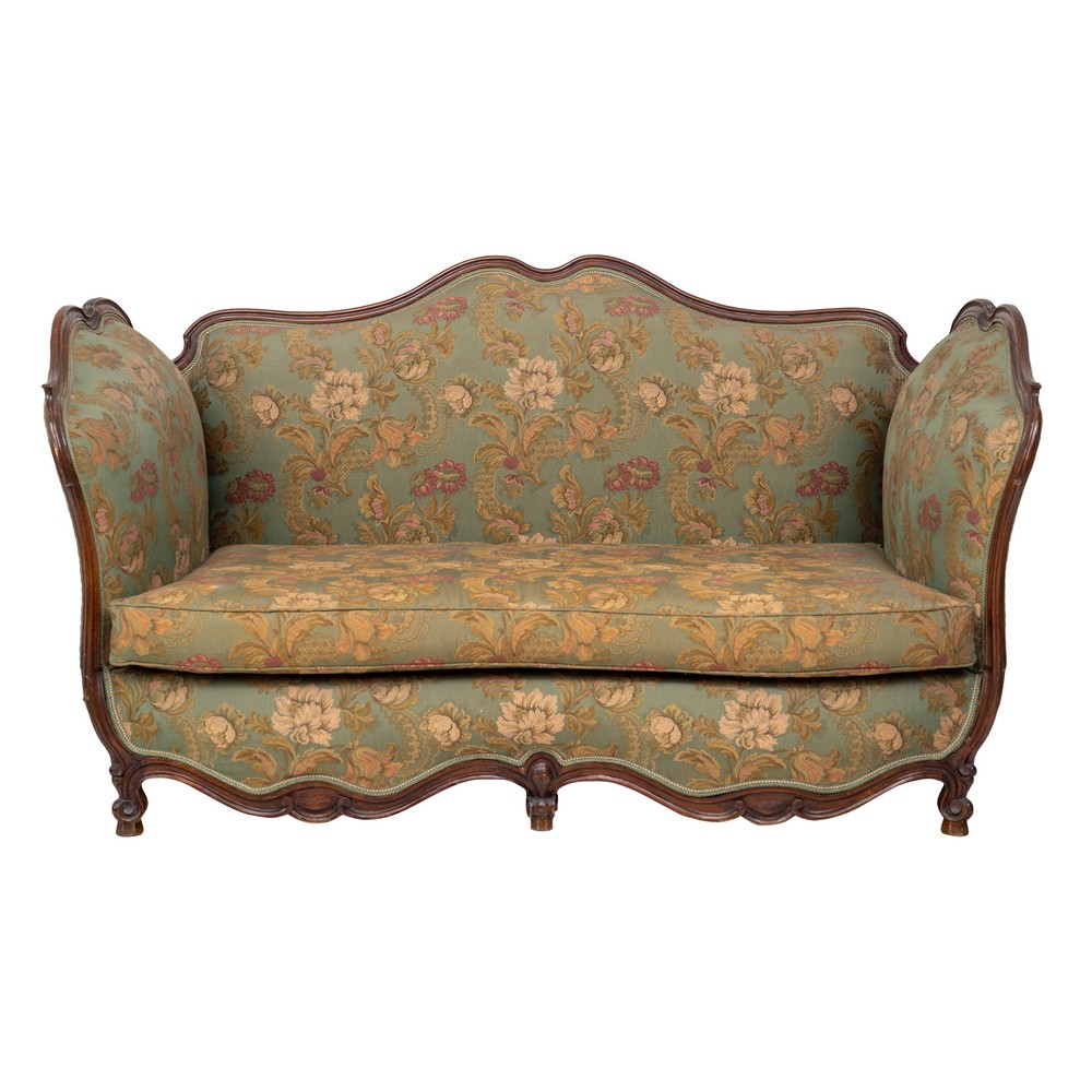 Divano in legno di mogano, tappezzeria a motivi floreali.