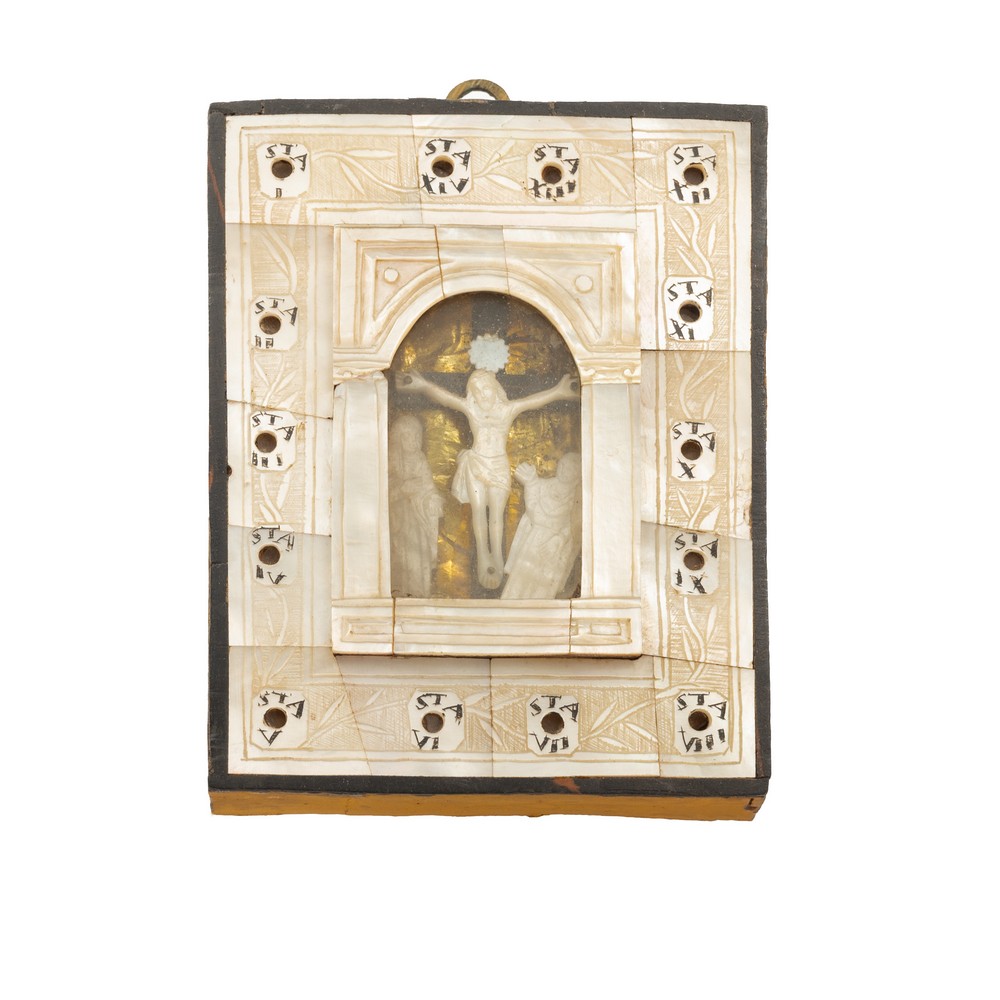 PICCOLO QUADRO in madreperla a forma di tempietto raffigurante "Crocifissione" (usure).