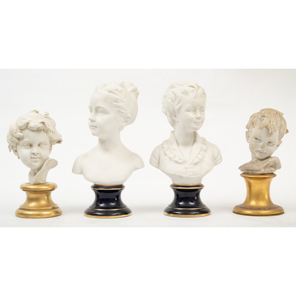 Due coppie di mezzibusti in biscuit, raffiguranti "Ragazze e bambini".