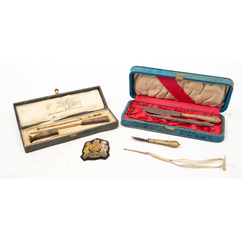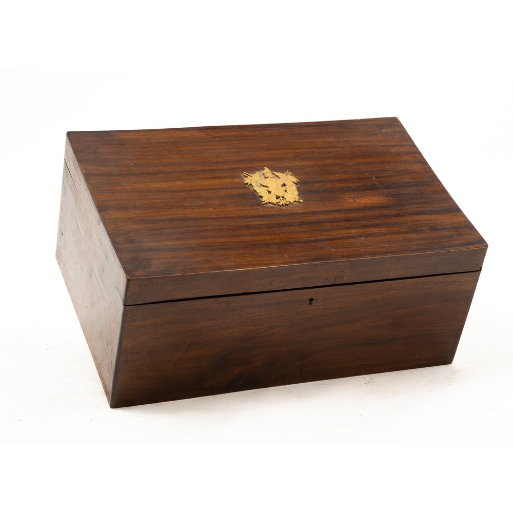 Scatola portalettere in legno di mogano, e due cofanetti con set da scrivania.