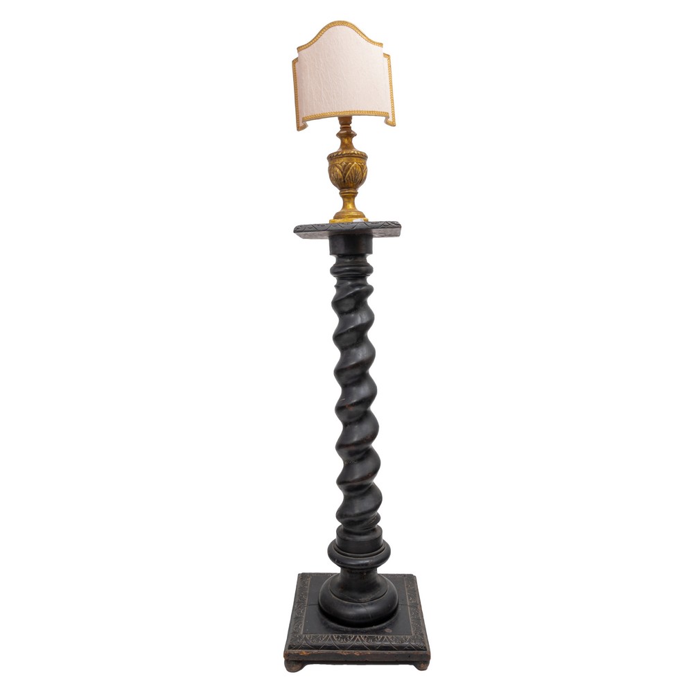 Cantone in legno ebanizzato con fusto a colonna e lume con base dorata a ventola.
