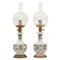 COPPIA LUMI in porcellana con base in metallo dorato e bocce in vetro.