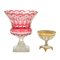 Vaso in cristallo molato, rosso rubino e trasparente e alzata in porcellana policroma.