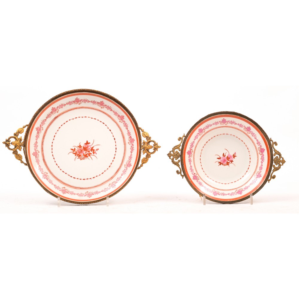 Un piatto e una ciotola compagnie delle indie in porcellana policroma montate in bronzo dorato.